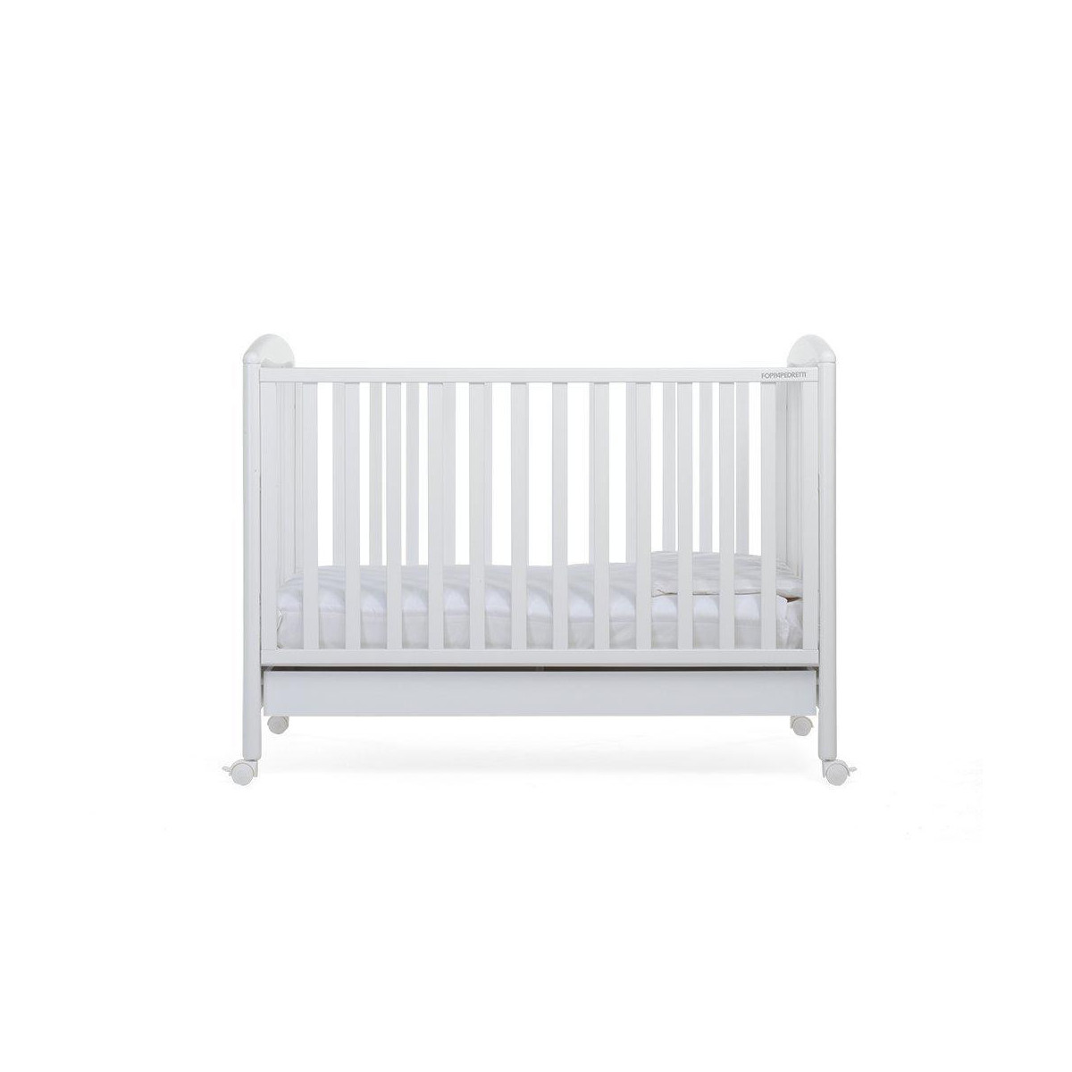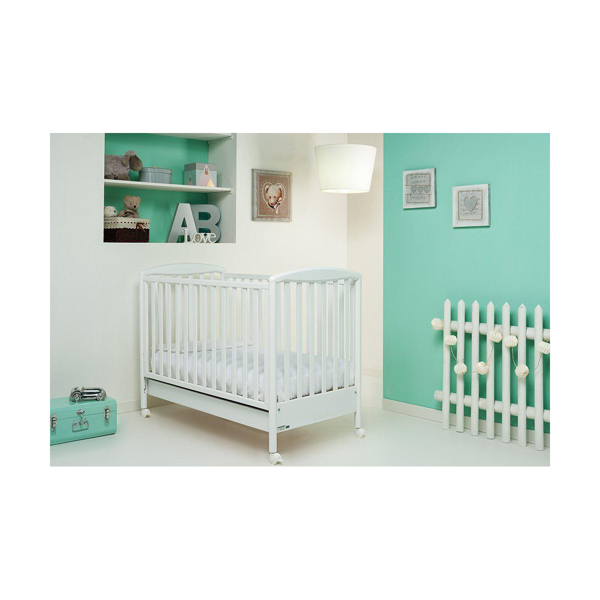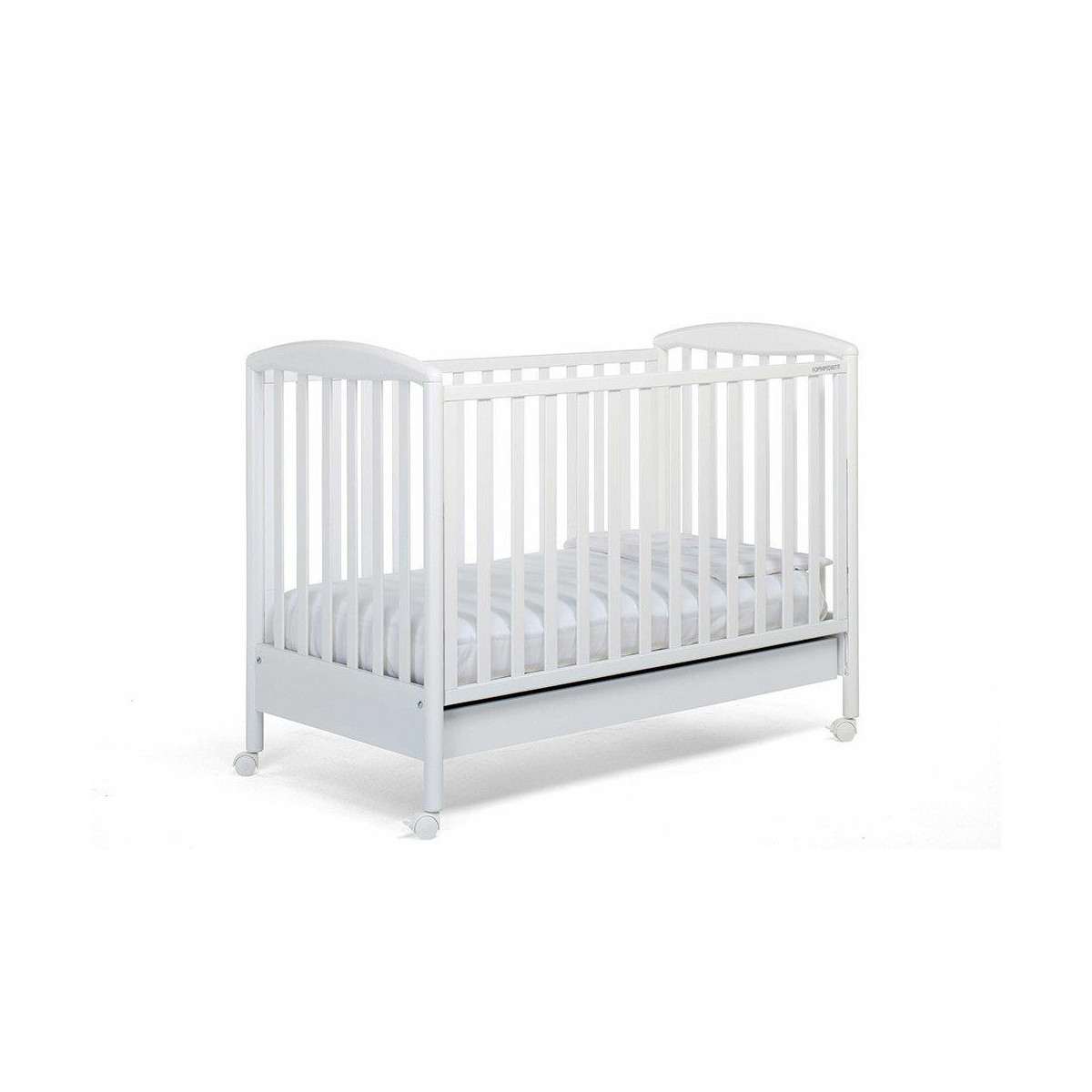 Il Lettino Foppapedretti Infanzia Lucy con spondine regolabili in altezza, ampio cassettone inferiore estraibile, ruote gommate di cui due con freno e rete in multistrato di pioppo.