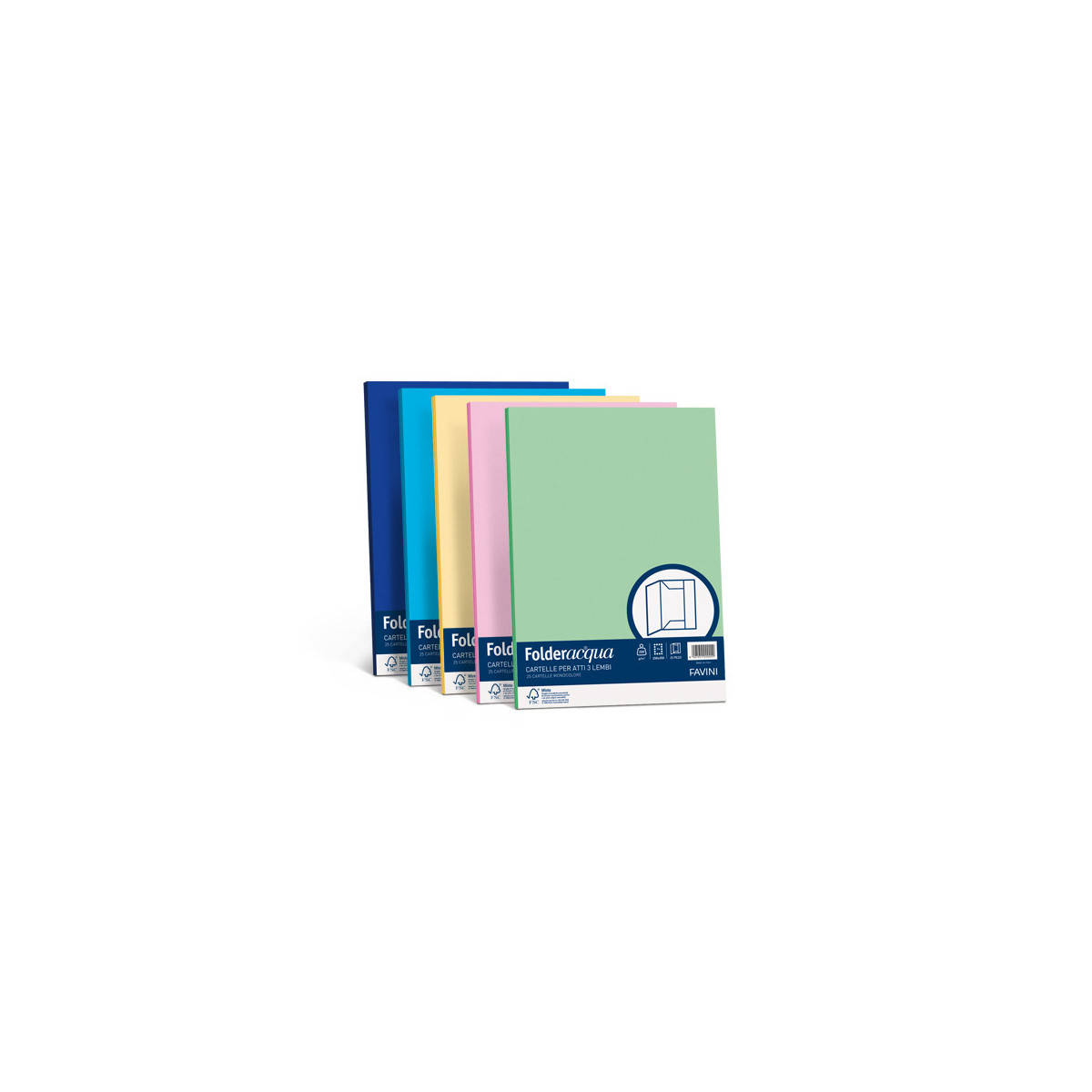 La vasta gamma di colori Luce-Acqua Favini riproposta in una collezione di cartelline con tre lembi per un’archiviazione pratica e funzionale.