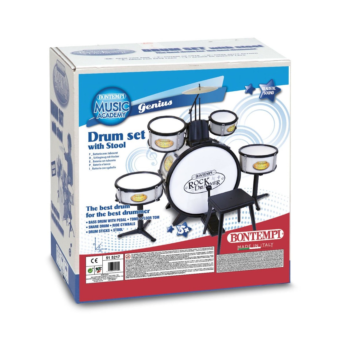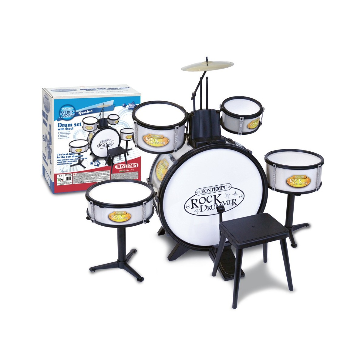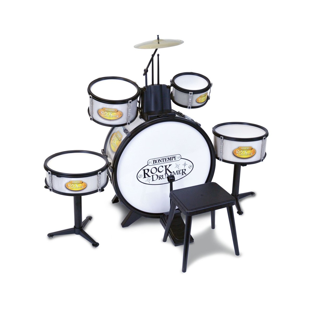Bontempi Rock Drum Set. Tipo di prodotto: Strumento musicale giocattolo, Colore del prodotto: Nero, Bianco, Età consigliata (min): 5 anno/i. Larghezza: 700 mm, Profondità: 400 mm, Altezza: 800 mm. Numero di pezzi: 6 pezzo(i), Larghezza imballo: 475 mm, Profondità imballo: 269 mm. Larghezza scatola principale: 47,5 cm, Lunghezza del cartone principale: 48,9 cm, Altezza scatola principale: 26,9 cm