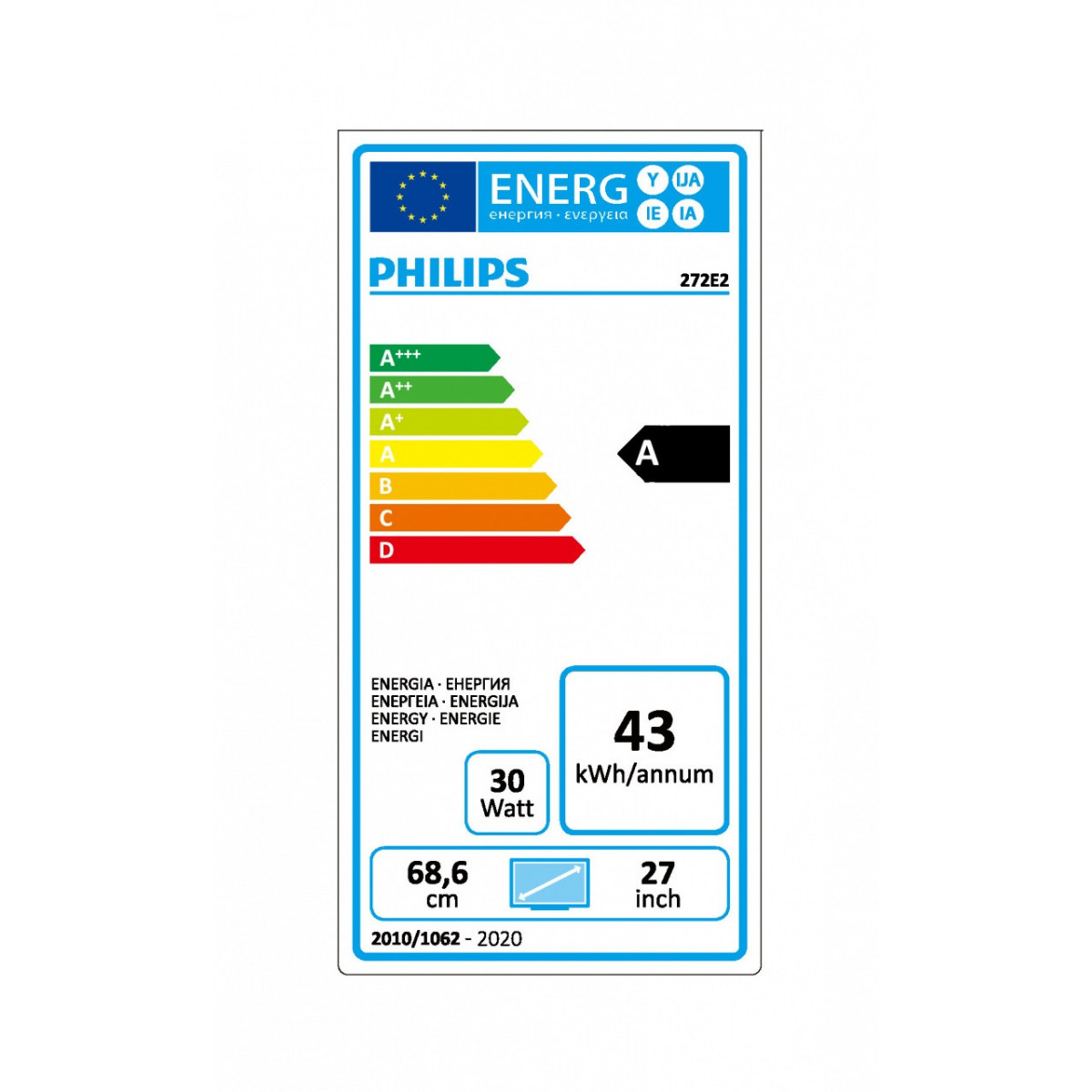 Philips 272E2FA/00. Dimensioni schermo: 68,6 cm (27"), Risoluzione del display: 1920 x 1080 Pixel, Tipologia HD: Full HD, Tecnologia display: LCD, Tempo di risposta: 4 ms, Rapporto d'aspetto nativo: 16:9, Angolo di visualizzazione (orizzontale): 178°, Angolo di visualizzazione (verticale): 178°. Altoparlanti incorporati. Montaggio standard VESA. Certificazione Energy Star, Colore del prodotto: Nero