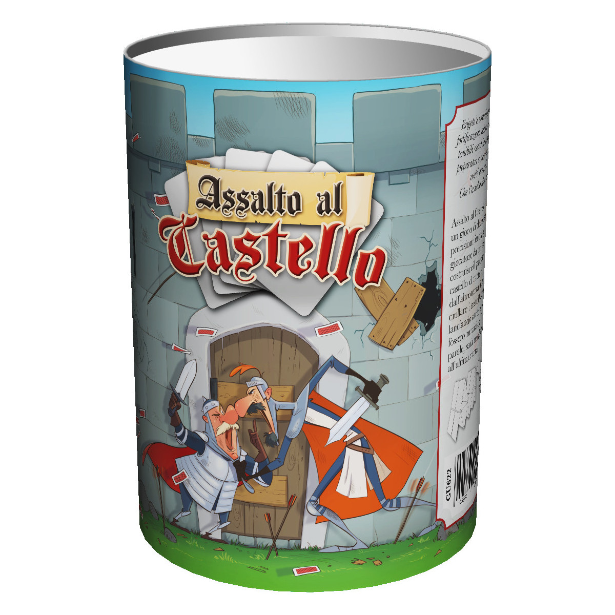 Assalto al Castello è un gioco di destrezza e precisione in cui ogni giocatore da un lato costruisce il proprio castello di carte e dall’altro tenta di far crollare i castelli avversari, lanciando carte come se fossero munizioni. In altre parole, sarà una battaglia all’ultima carta! All'inizio della partita, i giocatori ricevono un certo numero di carte Materiali, che utilizzano per erigere un castello di carte sopra il proprio tappetino Fondamenta. Non ci sono vincoli per quanto riguarda la costruzione, ma è importante che il castello sia in grado di reggere l'urto. Infatti, nel corso della partita, i giocatori a turno pescano delle carte Assedio, che permetteranno loro di attivare le catapulte; sarà possibile, sfruttando il gioco di polso, lanciare carte contro i castelli avversari per farli crollare. L'ultimo che rimane in piedi, vince la partita! E' possibile comprare una seconda confezione di Assalto al Castello per espandere le partite sino a 10 giocatori!