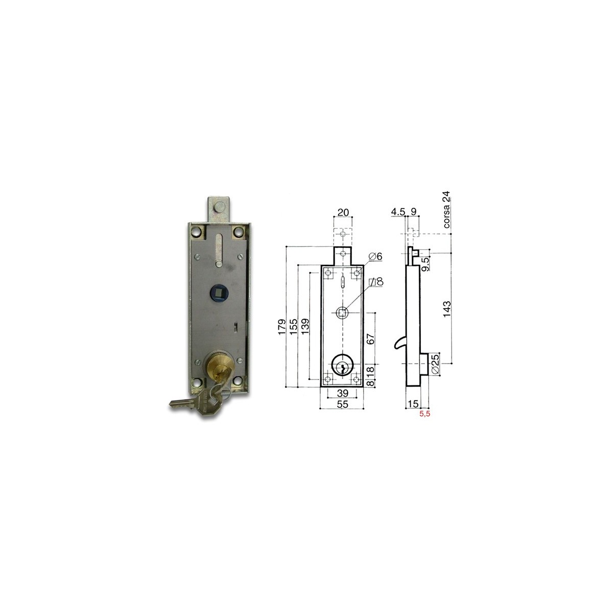 Prefer Serratura B551 per porte basculanti. Chiusura lato superiore. Sbloccaggio dall'esterno con chiave, dall'interno con levetta laterale. Maniglia q.8. Scatola zincata (155x55), cilindro in ottone.