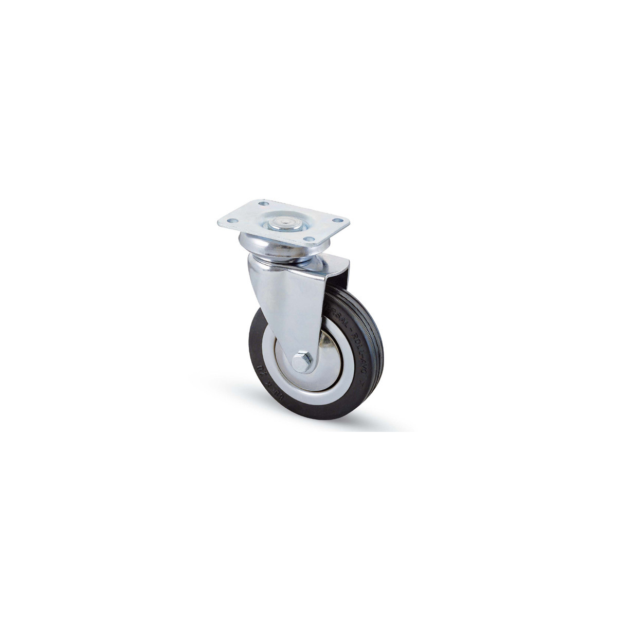Ruota per mobili, attrezzature ospedaliere, mobili metallici, elettrodomestici con ruota in gomma nera con parafili e flange acciaio stampato. Supporto in acciaio stampato rotante su corona di sfere. Assale imbullonato. Piastra misura 64x50. Articolo 155.