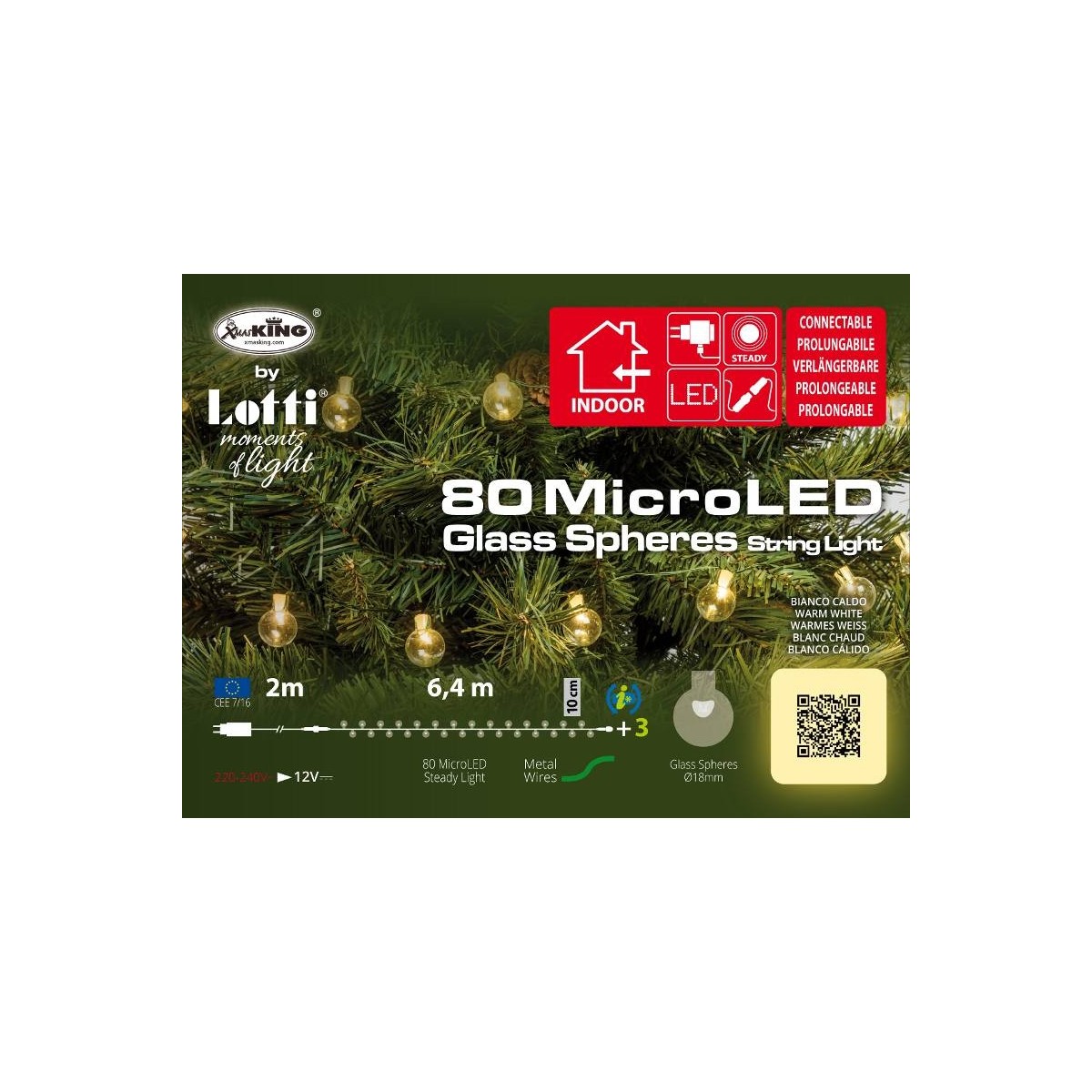 Catena 80 Sfere Vetro Trasparente Diametro 18mm 80 MicroLED BIANCO CALDO Prolungabile Luce Fissa Trasformatore IP20 Interno