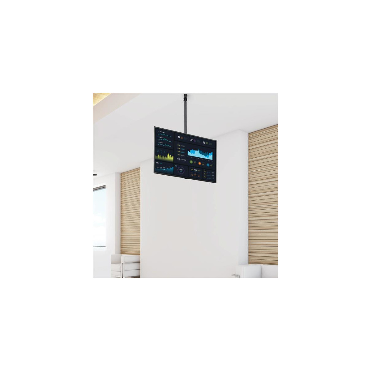 Il supporto per TV LCD è compatibile con molti tipi diversi di soffitto e può essere ruotato per adattarsi a qualsiasi ambiente, dai soffitti spioventi (fino a 60°) e inclinati a quelli orizzontali (piani), in modo che il display sia collocato sulla linea di visuale.. L'asta di prolunga può anche ruotare di + 180°/- 180° per una visione ottimale.