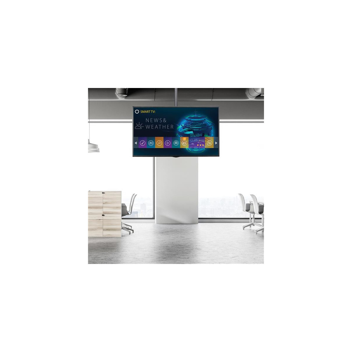 Grazie al supporto TV da soffitto è possibile collocare ben in vista un televisore al plasma, LED o LCD a schermo piatto in una posizione adatta per una visione confortevole, senza ingombrare pareti, scrivanie o pavimenti. È l'ideale per l'utilizzo nelle sale riunioni aziendali, nelle hall degli hotel, nei ristoranti, nei bar e in altri luoghi d'incontro. Il supporto TV da soffitto per carichi pesanti è compatibile con numerosi modelli di televisore, perché è in grado di sorreggere display con dimensioni comprese tra 32" e 75" e con un peso fino a 50 kg. I cavi rimangono nascosti perché si possono infilare all'interno dell'asta fuoriuscendo vicino alla sommità.