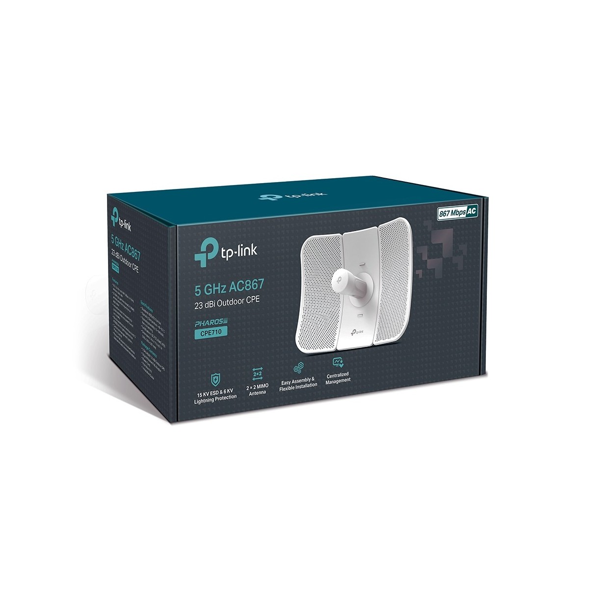 TP-LINK CPE710. Velocità massima di trasferimento dati: 867 Mbit/s, Velocità trasferimento Ethernet LAN: 10,100,1000 Mbit/s, Banda di frequenza: 5.15 - 5.85 GHz. Algoritmi di sicurezza supportati: HTTPS,SNMP,SSH,WPA,WPA2,WPA2-AES,WPA2-PSK,WPA2-TKIP, Funzioni SSID (Service Set Identifier): Multiple SSIDs, Trasmissione SSID, Attivazione/disattivazione della trasmissione SSID. Voltaggio di ingresso: 100 - 240 V, Frequenza di ingresso: 50/60 Hz, Voltaggio di uscita: 24 V. Installazione: Asta, Colore del prodotto: Bianco, Materiale della scocca: Plastica. Livello di guadagno dell'antenna (max): 23 dBi
