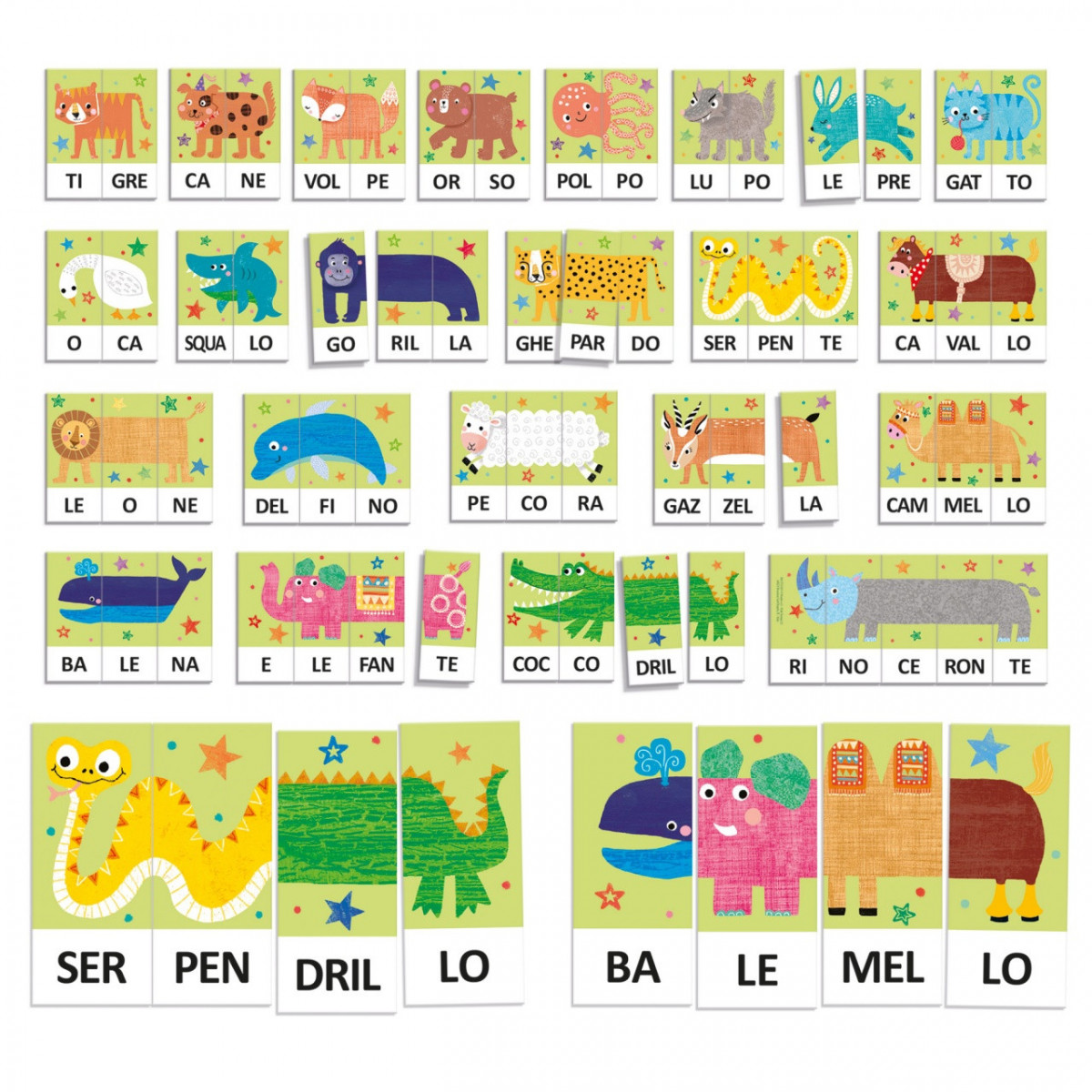 Un gioco originale per imparare a leggere le prime parole: unisci le sillabe e forma i nomi degli animali illustrati. Inoltre, ricomponendo le sillabe in modo diverso, puoi creare tanti animali fantastici e sviluppare immaginazione e creatività!