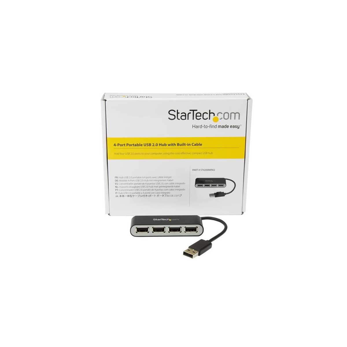 StarTech.com Hub USB 2.0 portatile a 4 porte con cavo integrato - Perno e Concentratore USB compatto - Mini Hub USB2.0. Interfaccia host: USB 2.0, Interfacce hub: USB 2.0. Velocità di trasferimento dati: 480 Mbit/s, Colore del prodotto: Nero, Argento, Materiale della scocca: Plastica. Tipologia alimentazione: USB. Larghezza: 27 mm, Profondità: 82 mm, Altezza: 15 mm. Larghezza imballo: 146 mm, Profondità imballo: 175 mm, Altezza imballo: 33 mm