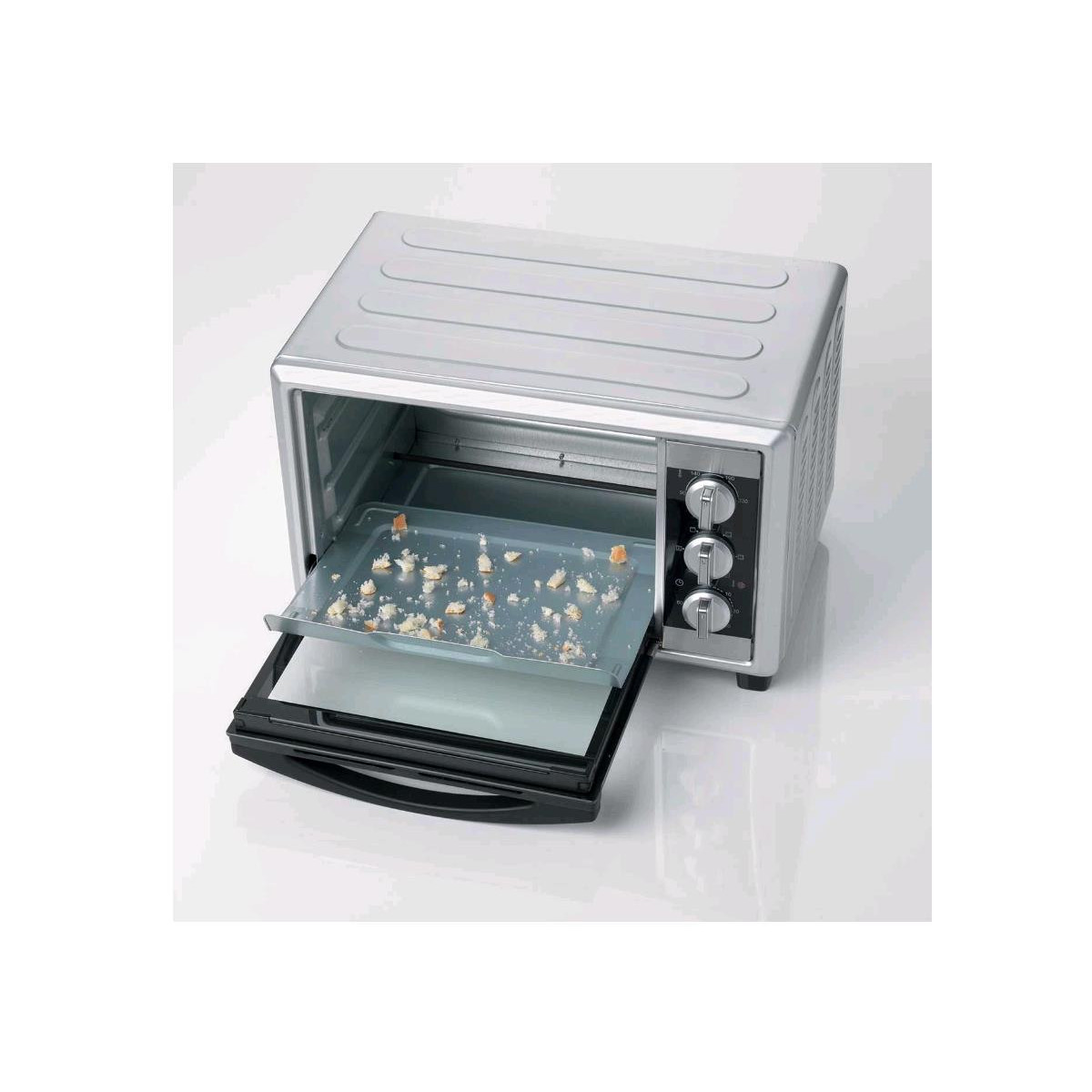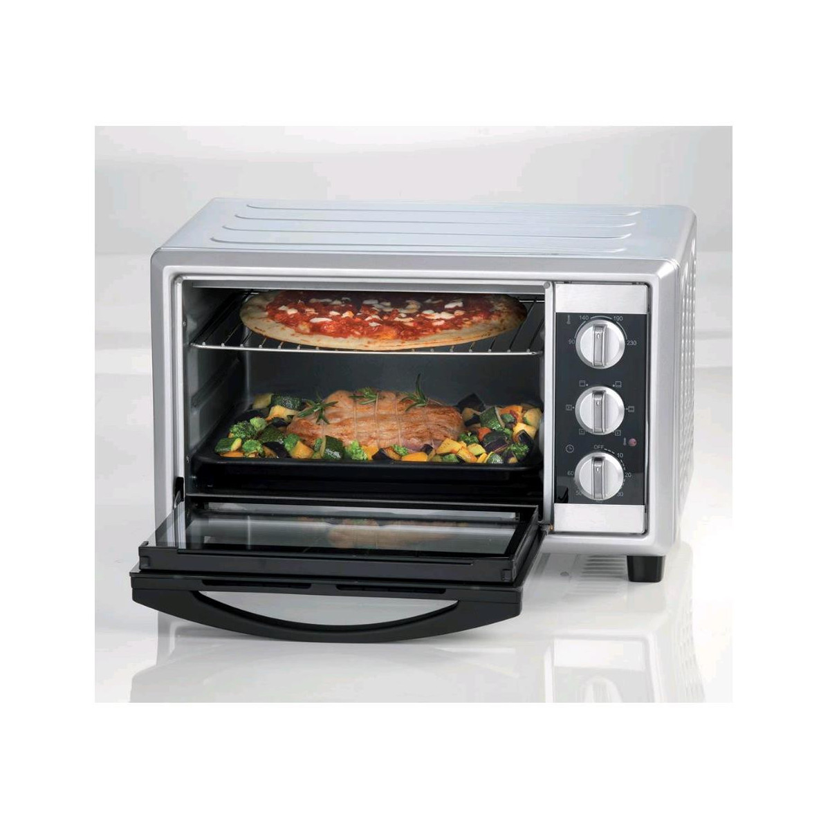 Forno elettrico dalla capacità di 30 litri, garantisce un?ottima cottura dei cibi grazie alla capienza e alla potenza del prodotto. Il forno raggiunge una temperatura di 230°C, ha sei posizioni di cottura e tramite la funzione ventilazione è in grado di cuocere anche più pietanze contemporaneamente, diventando un perfetto alleato della preparazione piatti più elaborati. Completo di griglia, leccarda, maniglia per estrazione accessori e di un comodo vassoio raccogli briciole per una facile pulizia.
