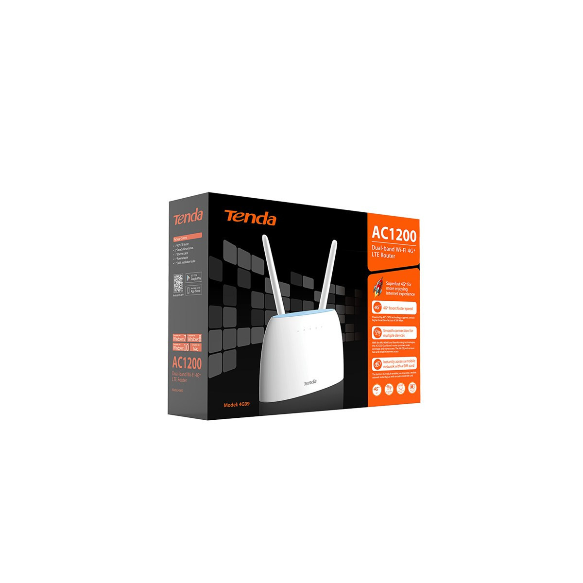 Tenda 4G09. Banda Wi-Fi: Dual-band (2.4 GHz/5 GHz), Wi-Fi standard: Wi-Fi 5 (802.11ac), Intervallo di trasferimento dei dati WLAN (max): 867 Mbit/s. Tipo di interfaccia LAN Ethernet: Gigabit Ethernet, Velocità trasferimento Ethernet LAN: 10,100,1000 Mbit/s, Tecnologia di cablaggio: 10/100/1000Base-T(X). Standard 3G: WCDMA, Standard 4G: LTE-TDD & LTE-FDD. Protocolli di rete supportati: IPV4/IPV6. Tipo di prodotto: Router portatile, Colore del prodotto: Bianco, Indicatori LED: LAN, Collegamento, Potenza, WAN, WLAN