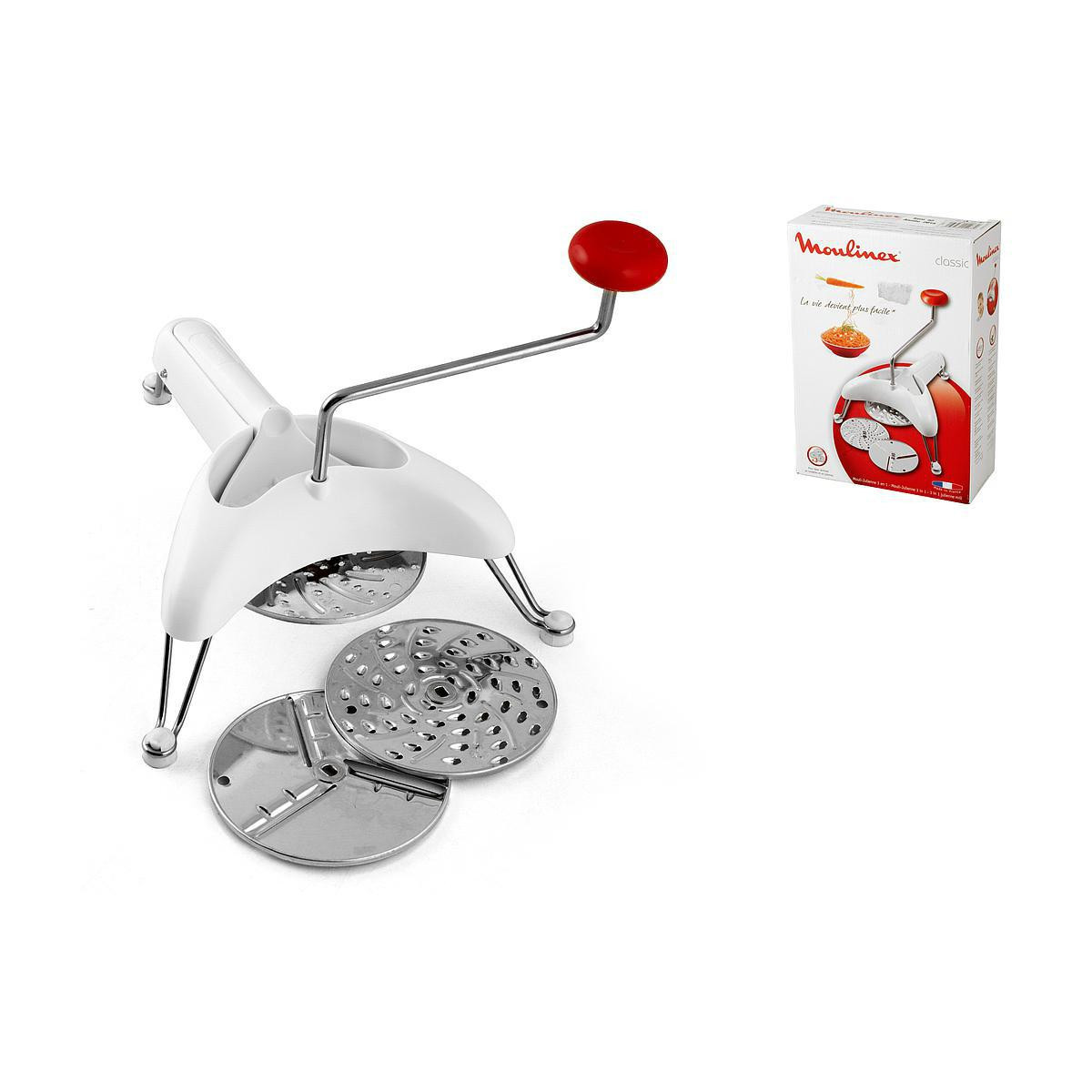Accessorio manuale per la cucina. Utile per: grattugiare, affettare e tagliare a julienne. 3 dischi inox in dotazione.