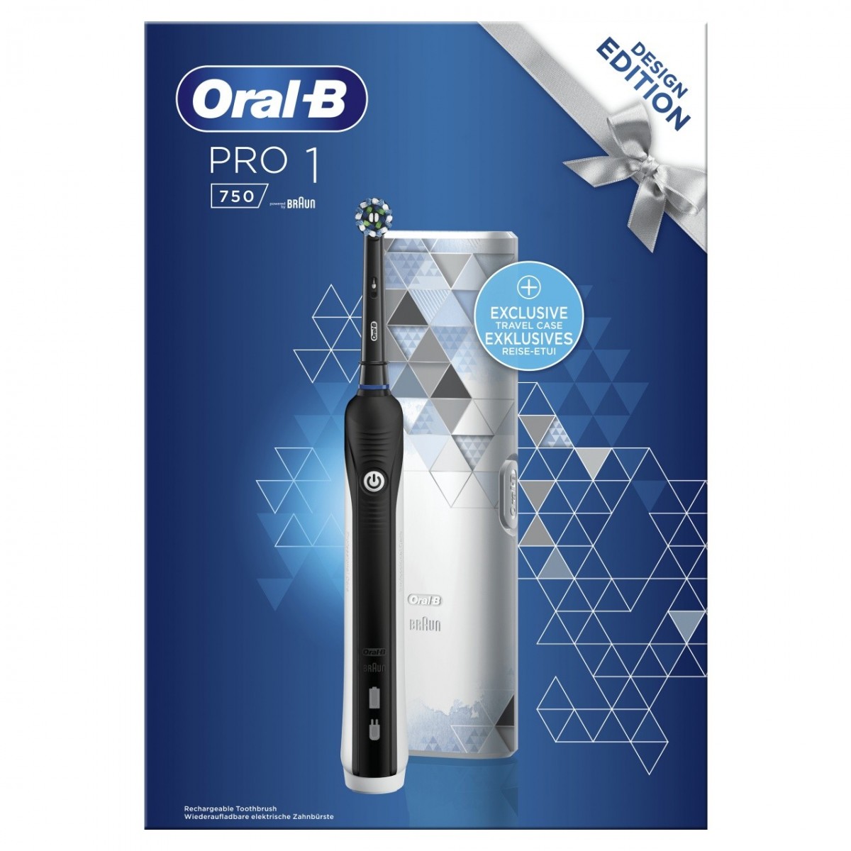 Oral-B PRO 1 - 750. Utilizzo: Adulto, Tipo di spazzolino da denti: Spazzolino rotante-oscillante, Colore del prodotto: Nero, Bianco. Alimentazione: Batteria, Tipo batteria: Batteria integrata, Durata della batteria: 10 Days. Peso: 329,25 g, Larghezza imballo: 100 mm, Profondità imballo: 178 mm. Numero di manici inclusi: 1 pezzo(i), Numero di testine incluse: 1 pezzo(i). Larghezza scatola principale: 31,3 cm, Lunghezza del cartone principale: 36,4 cm, Altezza scatola principale: 26,5 cm