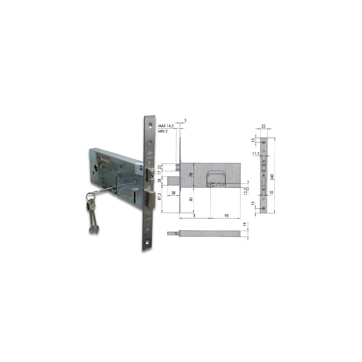 Cisa 57360.90.0 Serratura da infilare per fasce, doppia mappa, 4 mandate, scrocco a rullo, regolabile da 2 a 14,5 mm., quadro maniglia, fornita con 3 chiavi. Dimensioni: entrata mm.90.