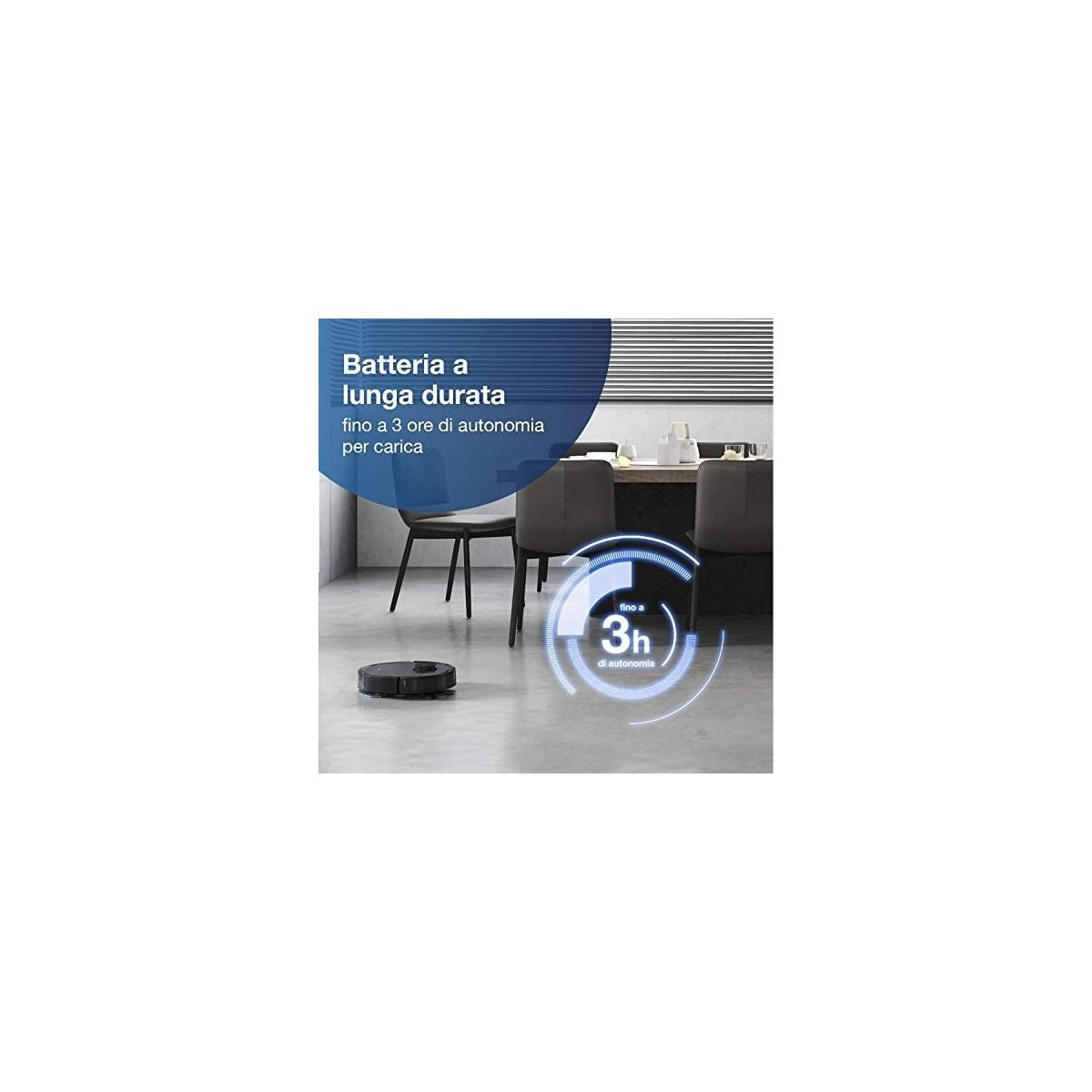 Una carica dura fino a tre ore di funzionamento. Il robot pulisce ambienti domestici fino a 300 mq. (*Con potenza di aspirazione standard e secondo i test di laboratorio condotti da ECOVACS; il valore effettivo può differire in base a diversi ambienti casalinghi.)