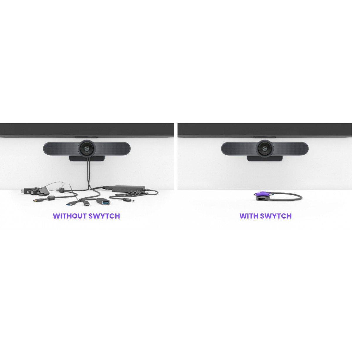 Con una singola connessione USB, Logitech Swytch collega un notebook al display, alla fotocamera e ai dispositivi audio della stanza.