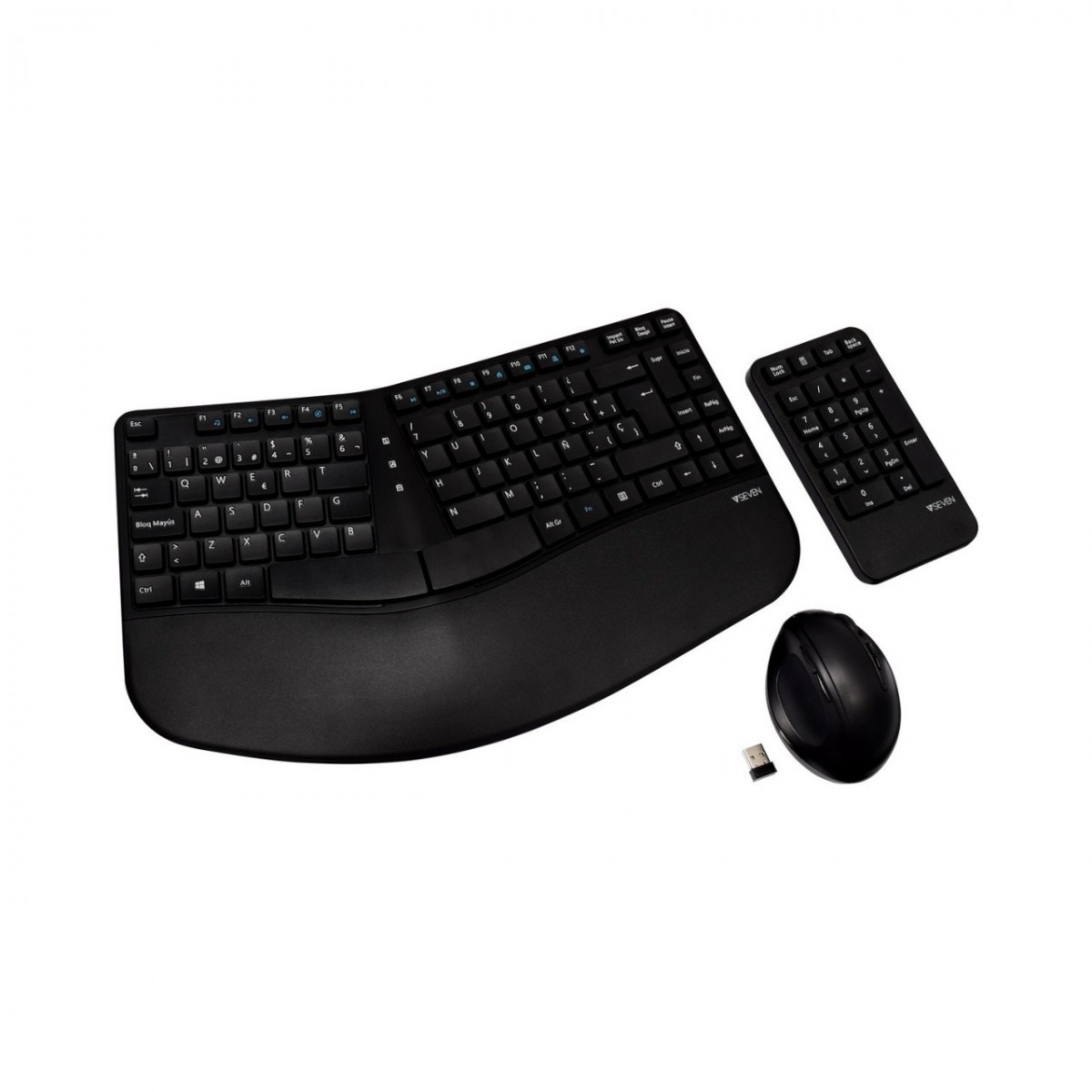 V7 Tastiera, mouse e combinazione con tastierino wireless ergonomici. Fattore di forma tastiera: Standard. Stile tastiera: Curvo. Interfaccia dispositivo: RF Wireless. Riposo del polso. Utilizzo raccomandato: Ufficio. Colore del prodotto: Nero. Mouse incluso