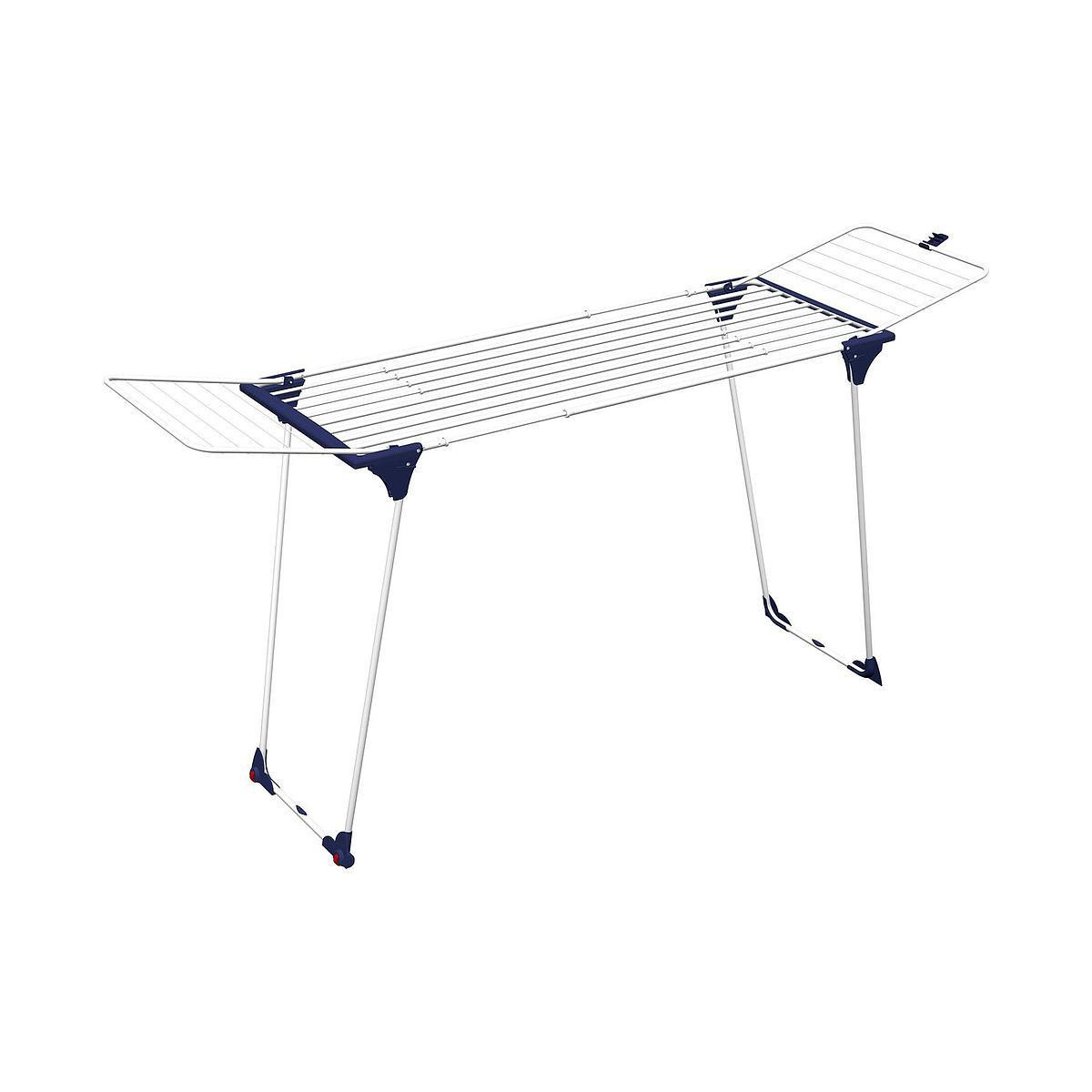 Stendibiancheria da pavimento estensibile con gambe a ponte. 27 metri di stenditura. In acciaio. Griglia estensibile da 186 cm a 257 cm: fino a 3 lavatrici. Fermaprolunghe che evita aperture accidentali. Fili grossi antipiega, due prolunghe laterali e protezioni antigraffio. Angolari stabilizzanti. Ruote per facilitare lo spostamento. Verniciato bianco, plastiche blu di prussia. Dim. aperto (LxPxH) 257x57x99,5 cm. Certificato TUV-GS. Prodotto in Italia.