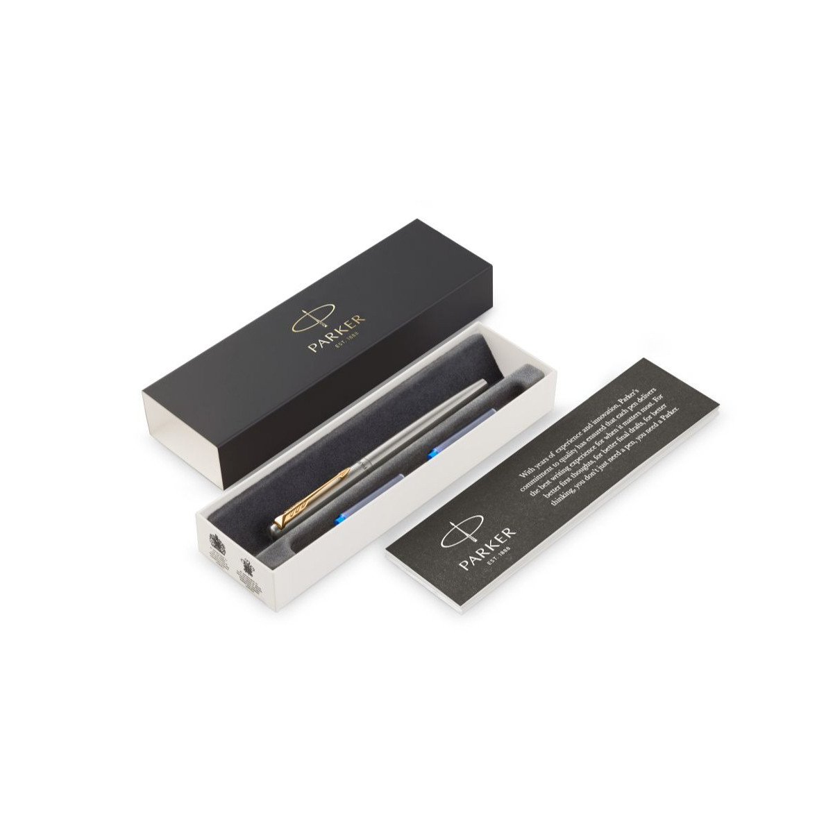 Parker Jotter. Colore del prodotto: Nero, Oro, Acciaio inossidabile, Materiale della scocca: Acciaio inossidabile, materiale del pennino: Acciaio inossidabile. Tipo di imballo: Confezione. Quantità per pacco: 1 pezzo(i)