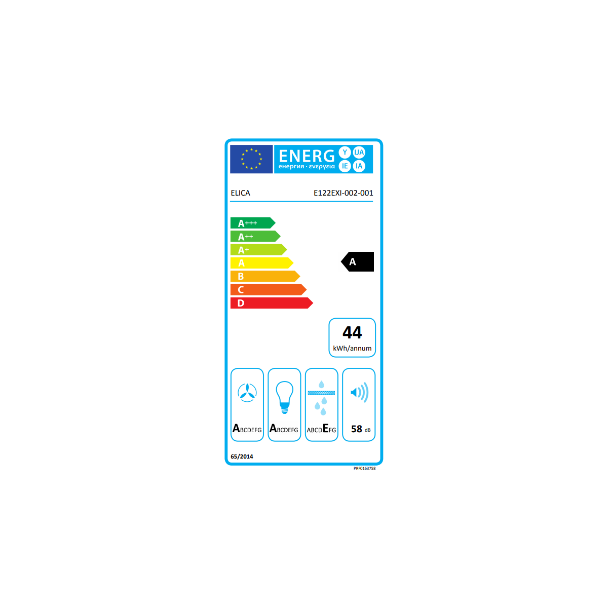 Elica PRF0163758. Potenza massima di estrazione: 700 m³/h, Classe di efficienza dinamica del fluido: A, Classe di efficienza luminosa: A. Tipo: Cappa aspirante a parete, Colore del prodotto: Nero, Potenza lampadina: 7 W. Tipo di filtro antigrasso: Alluminio/Carbone. Classe efficienza energetica: A, Consumo energetico annuo: 44 kWh, Potenza motore: 280 W. Larghezza: 1200 mm, Profondità: 360 mm