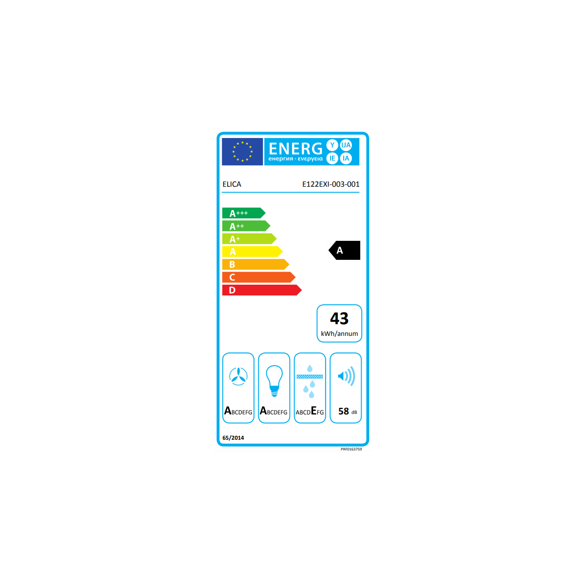 Elica PRF0163759 RULES NAKED/F/120. Potenza massima di estrazione: 700 m³/h, Tipo di estrazione: Aspirante, Classe di efficienza dinamica del fluido: A. Tipo: Cappa aspirante a parete, Potenza lampadina: 7 W, Numero di lampadine: 2 lampadina(e). Tipo di filtro antigrasso: Alluminio/Carbone. Classe efficienza energetica: A, Consumo energetico annuo: 43,4 kWh, Scala di efficienza energetica: Da A+++ a D. Larghezza: 1198 mm, Profondità: 360 mm, Altezza (min.): 90 cm