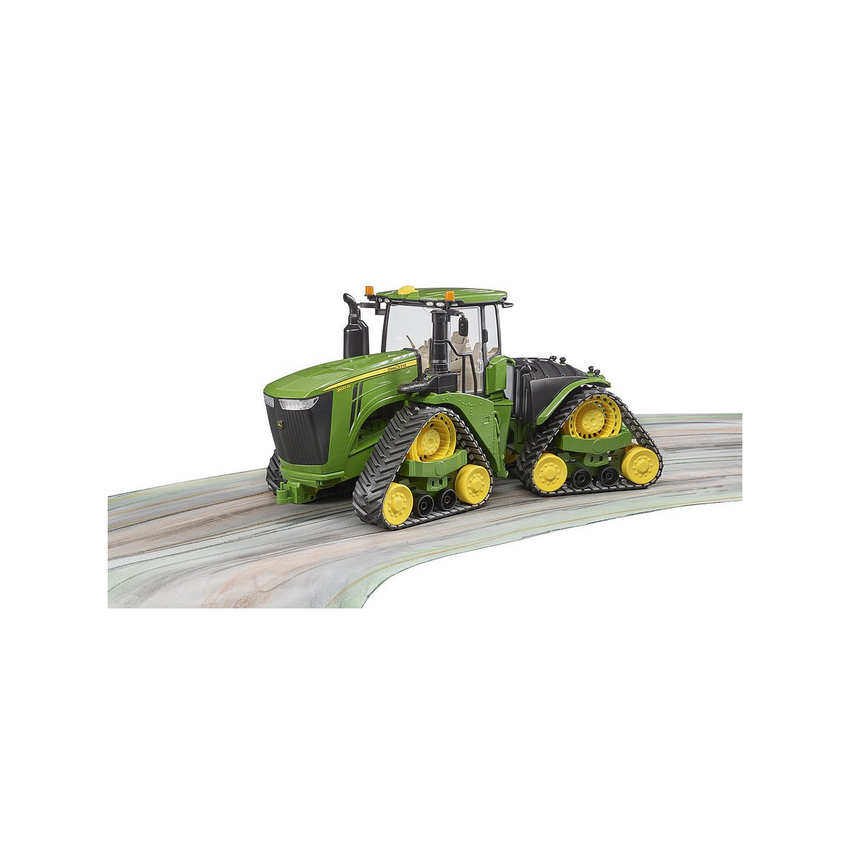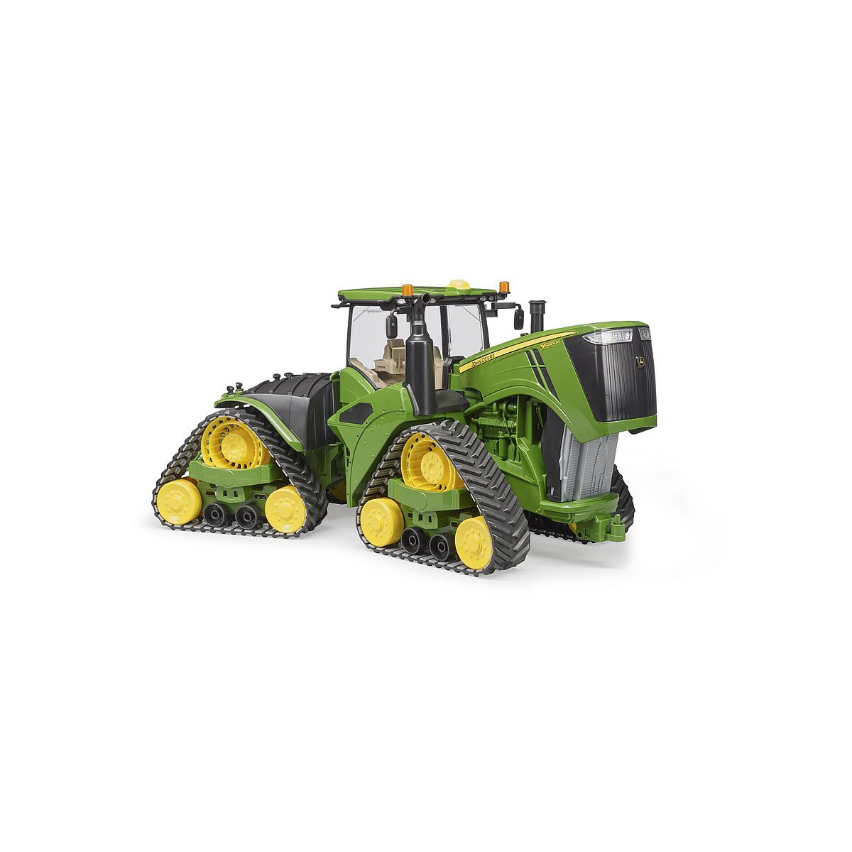 Di pari passo all'aumentare delle esigenze delle moderne aziende agricole, è più importante che mai incrementare l'efficienza delle macchine in servizio. Con il modello 9620RX, John Deere presenta il trattore cingolato più grande e più potente visto finora. Con una potenza del motore fino a 670 HP e i quattro cingoli, che gli conferiscono una potenza di traino favolosa e la migliore protezione possibile del suolo, questo esemplare è il partner ideale quando si tratta di gestire lavori di traino pesanti con attrezzi quali coltivatori o aratri. Questo imponente trattore, nella super-realistica scala 1:16, fa ora il suo ingresso nell'assortimento BRUDER. Come l'originale, il modello presenta la nuovissima trazione a cingoli e lo sterzo articolato in stile fuoristrada. La cabina del conducente è dotata di portiera apribile e un imponente cofano motore, che può essere sollevato per dare un'occhiata all'enorme motore al suo interno. Al gancio di traino con unità di sollevamento regolabile in altezza è possibile fissare numerose unità da rimorchio dell'assortimento agricolo BRUDER.