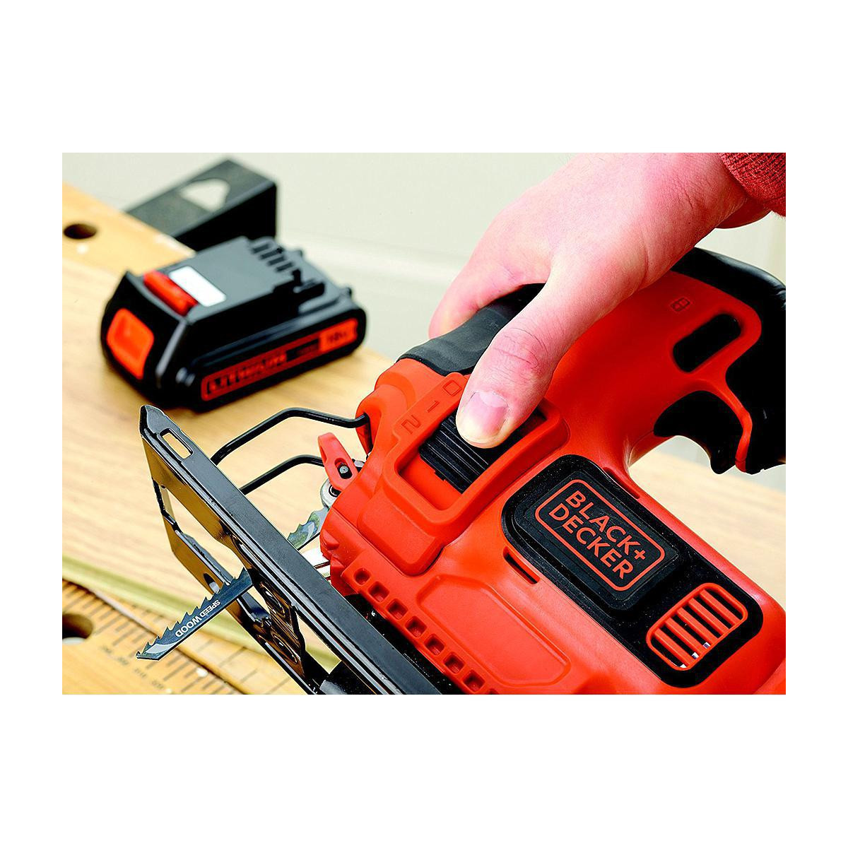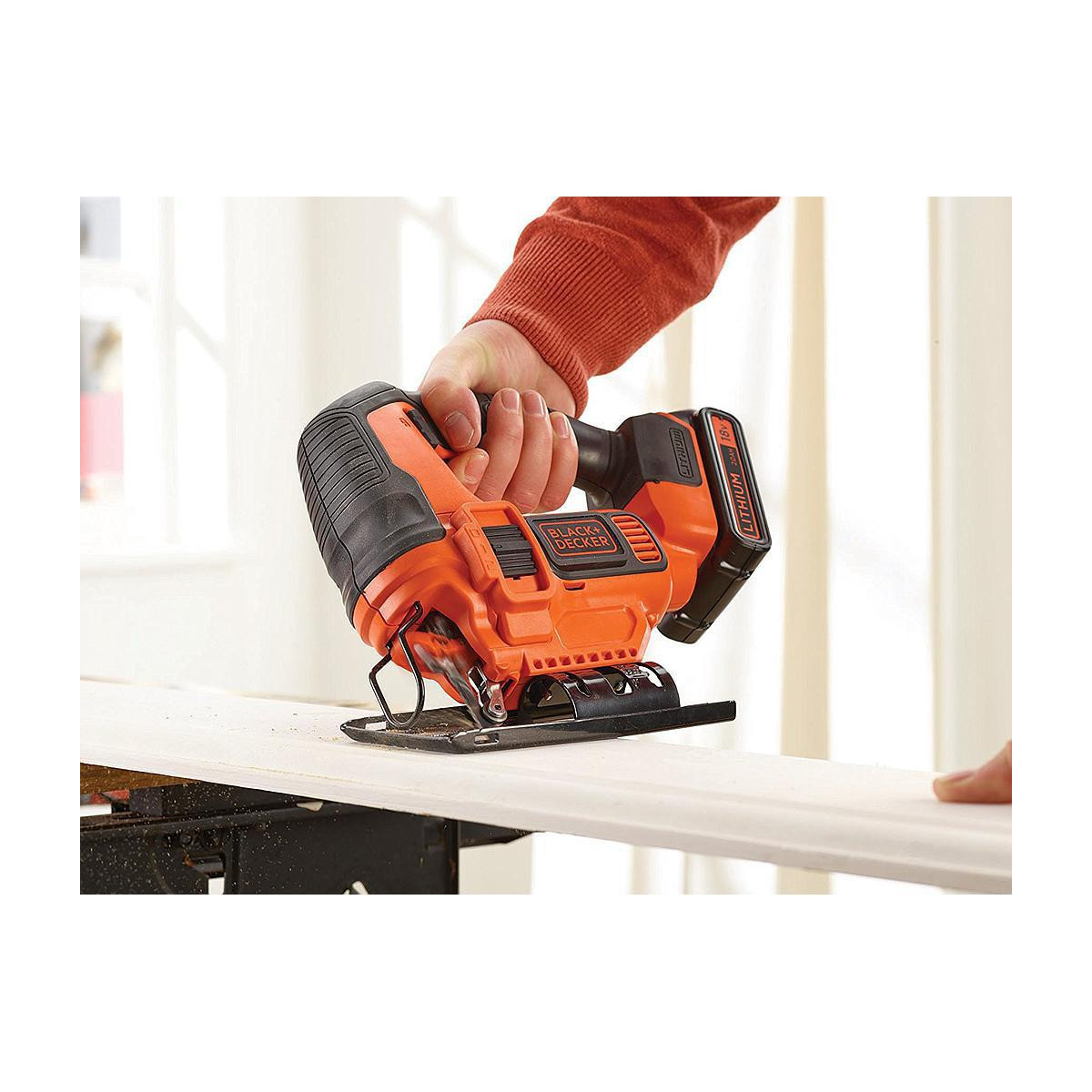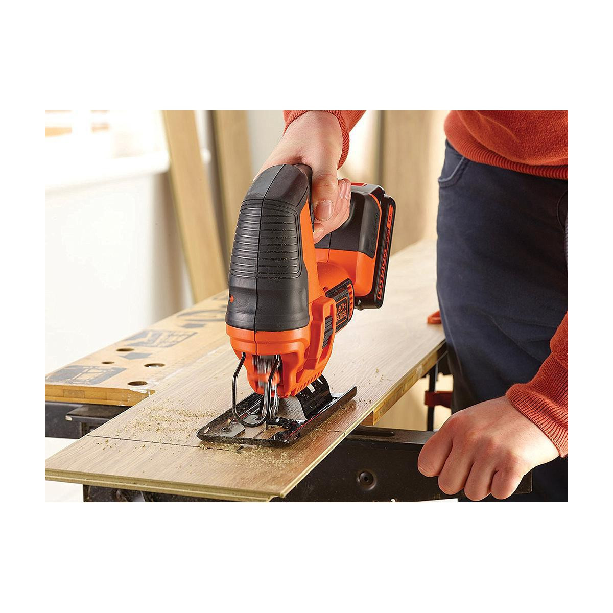 Il seghetto alternativo con batteria 18V al Litio di BLACK+DECKER ti fornisce tutta la potenza e la versatilità di cui hai bisogno per effettuare tagli dritti, curvi ed inclinati nella massima semplicità e precisione. Il potente motore e l?azione pendolare ti consentono di realizzare tagli rapidi ed accurati su legno, metallo e materiali plastici senza l?ingombro del cavo. Ottima visibilità della linea di taglio e design leggero e compatto: tutti elementi che contribuiscono a realizzare tagli puliti e precisi. Il sistema di cambio lama senza accessori consente rapidità nella sostituzione. Prodotto parte del sistema 18V Litio di BLACK+DECKER.
