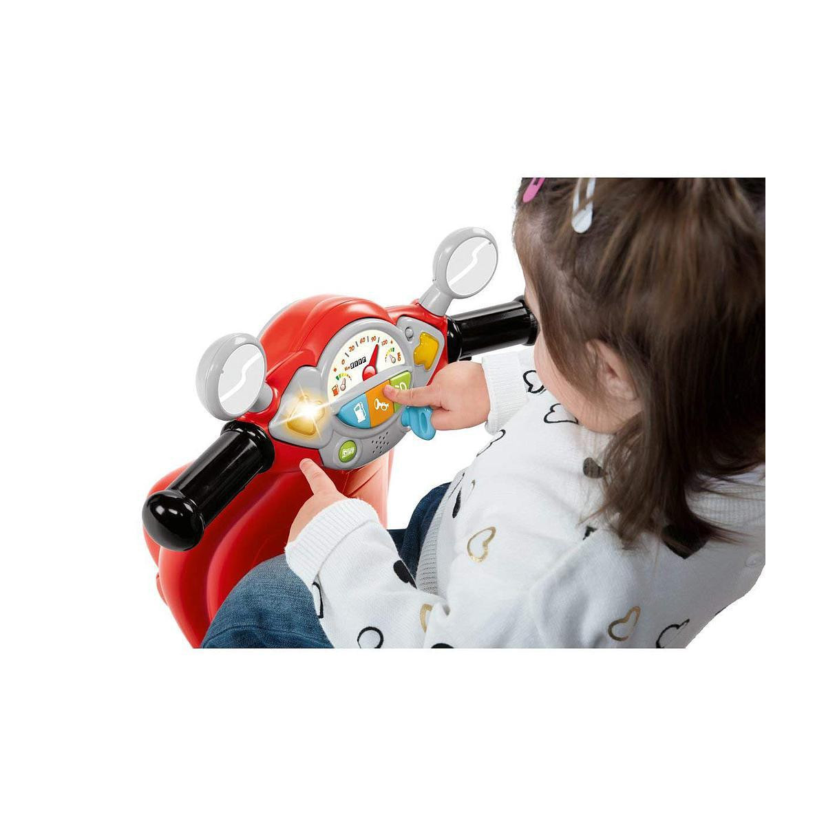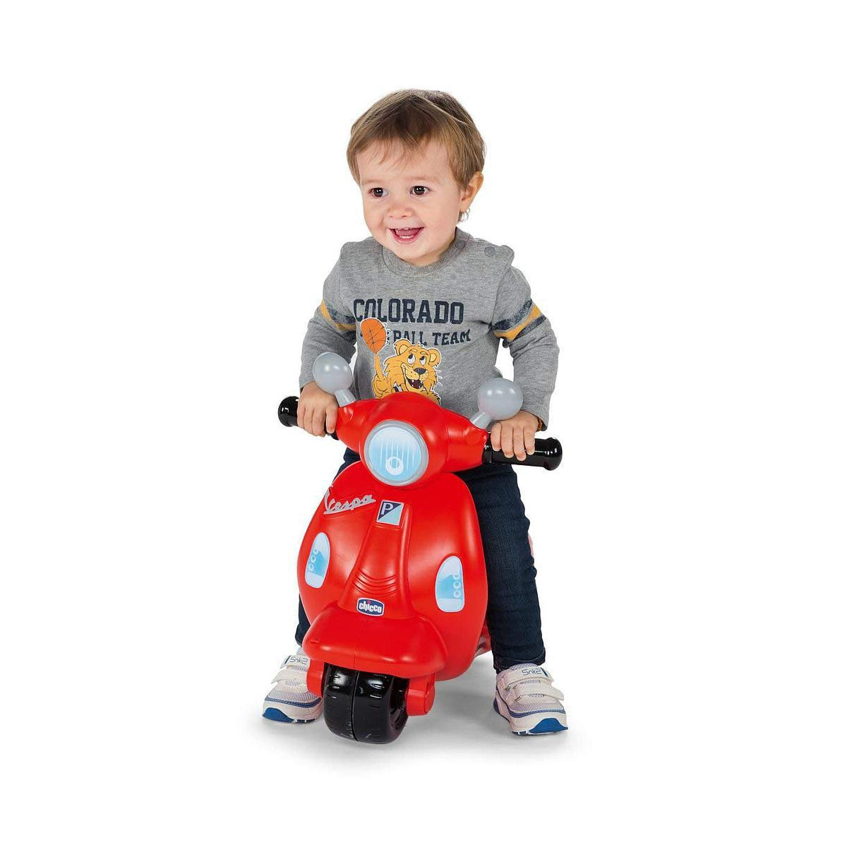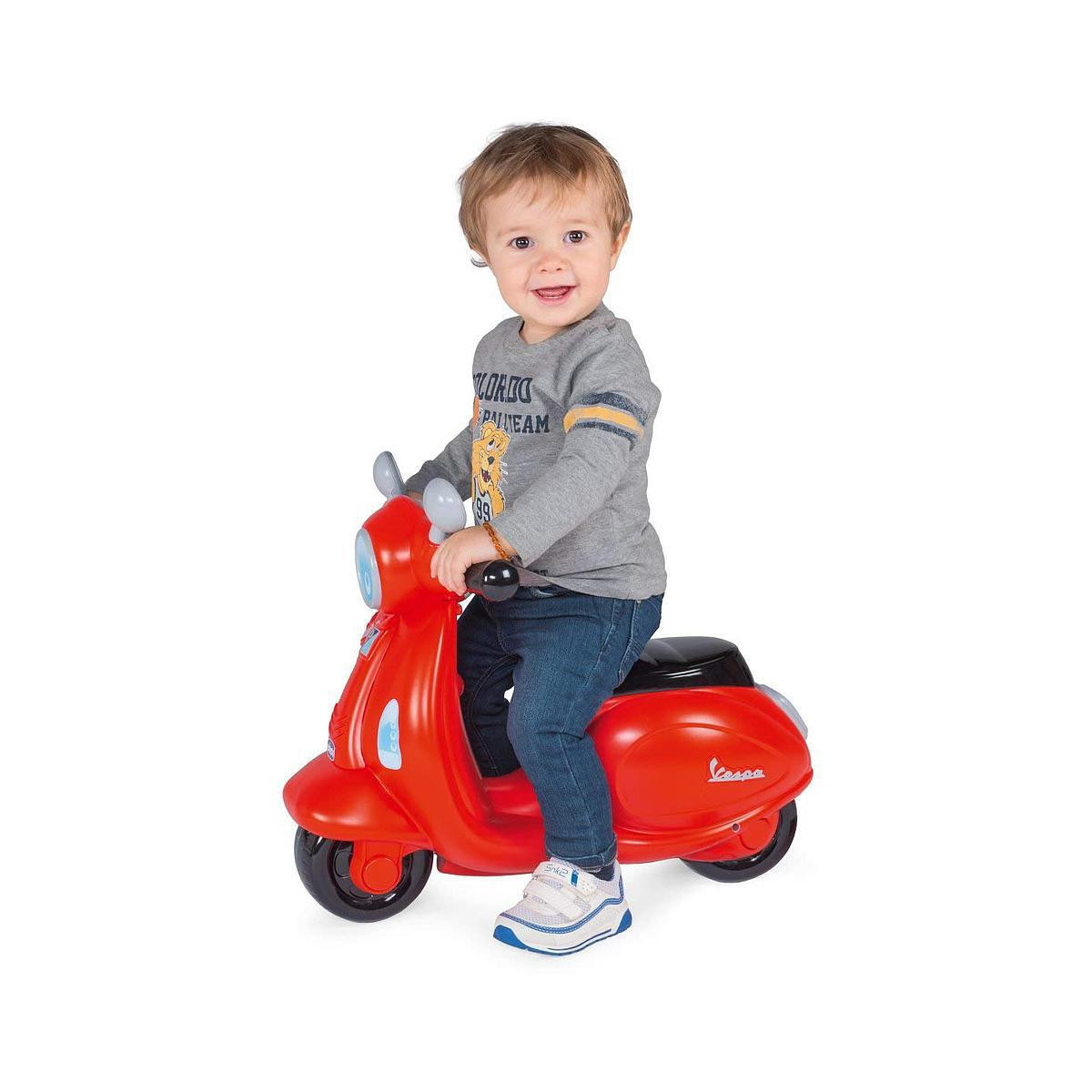 Vespa cavalcabile con due modalità di gioco: guida facilitata con rotelle di supporto rimovibili e guida libera per bimbi più esperti. Pannello elettronico con clacson, luci e eusoni.