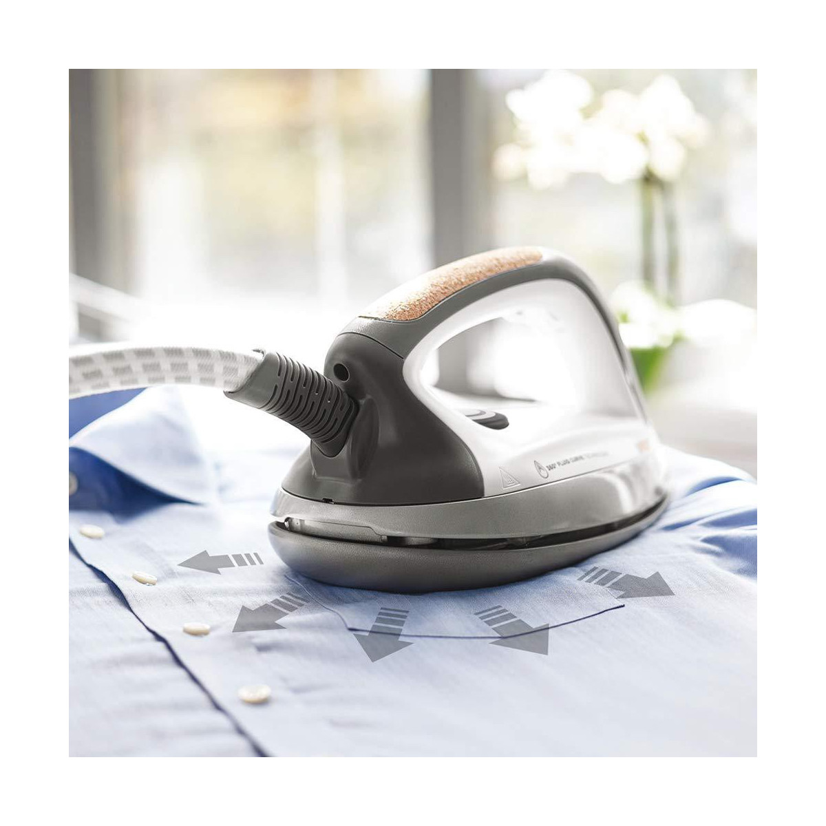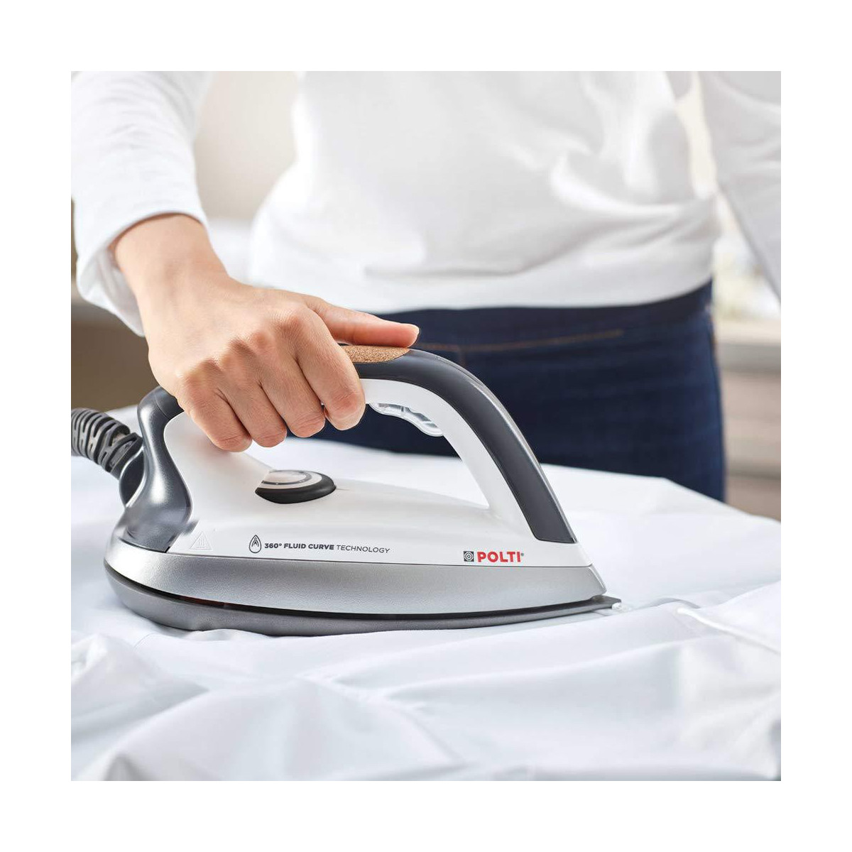 L'inserto in sughero traspirante presente sul manico, unito all'innovativa forma del ferro, rendono la stiratura semplice e piacevole.