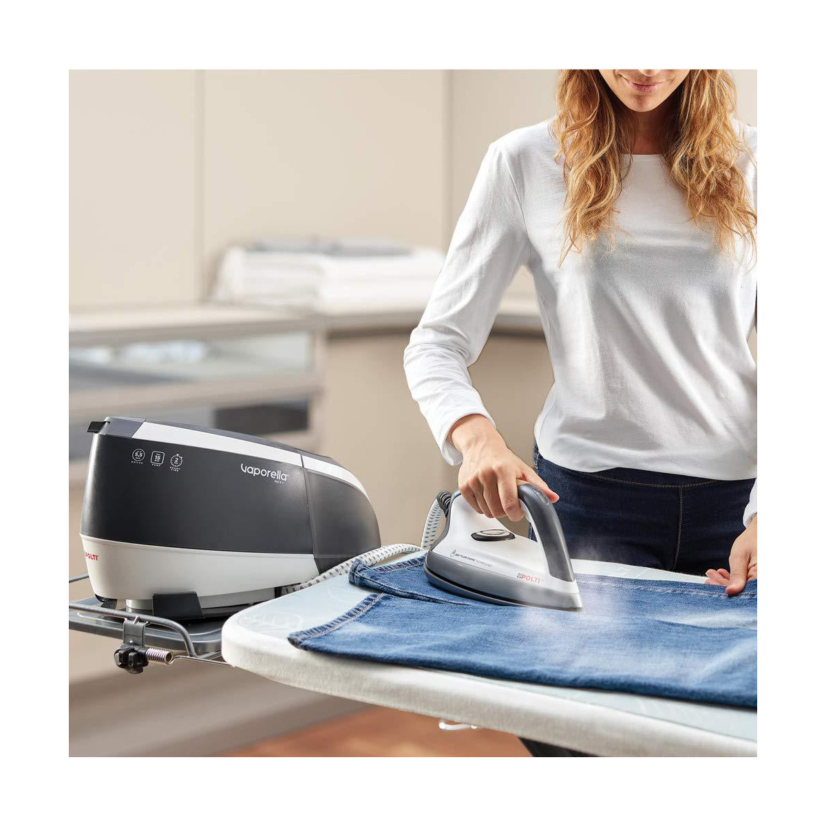 Stai stirando ma è suonato il campanello e devi aprire la porta? Nessun problema! Vaporella Next si spegne automaticamente dopo 10 minuti di inutilizzo, per riattivare la macchina sarà sufficiente premere il tasto corrispondente al programma di stiratura che desideri utilizzare.