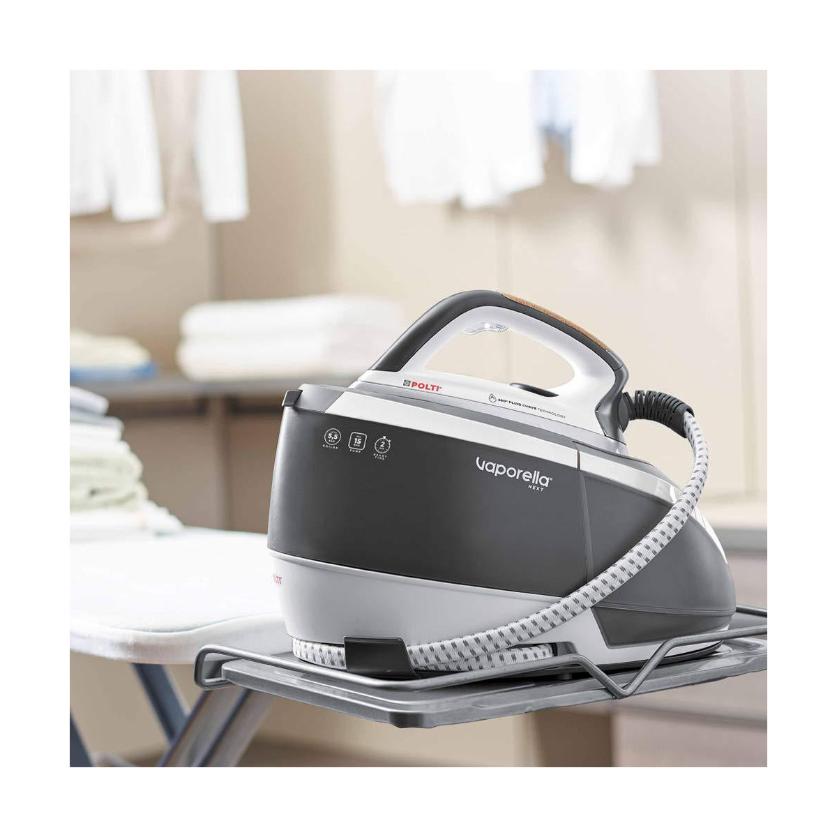 Potenza, performace e precisione: ecco la nuova Vaporella Next, 100% italian design. Scegli la funzione pià adatta ai tuoi capi e la temperatura corretta della piastra ruotando la manopola sul ferro. La potente caldaia da 5,5 BAR ti consente di ottenere ottimi risultati di stiratura in poco tempo. Per i tessuti più delicati, mantieni il ferro alla temperatura più bassa e stira senza premere il pulsante del vapore.