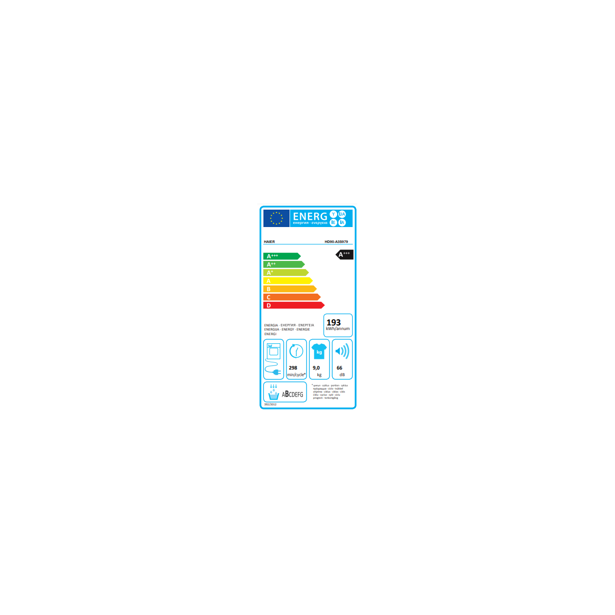 Haier HD90-A3S979. Posizionamento dell'apparecchio: Libera installazione, Tipo di carica: Caricamento frontale, Sistema di asciugatura: Pompa di calore. Capacità cestello: 9 kg, Classe efficacia di asciugatura: A, Emissione acustica: 67 dB. Classe efficienza energetica: A+++, Consumo energetico annuo: 193 kWh, Fonte di calore: Elettrico. Larghezza: 595 mm, Profondità: 675 mm, Altezza: 845 mm. Larghezza imballo: 668 mm, Profondità imballo: 748 mm, Altezza imballo: 890 mm
