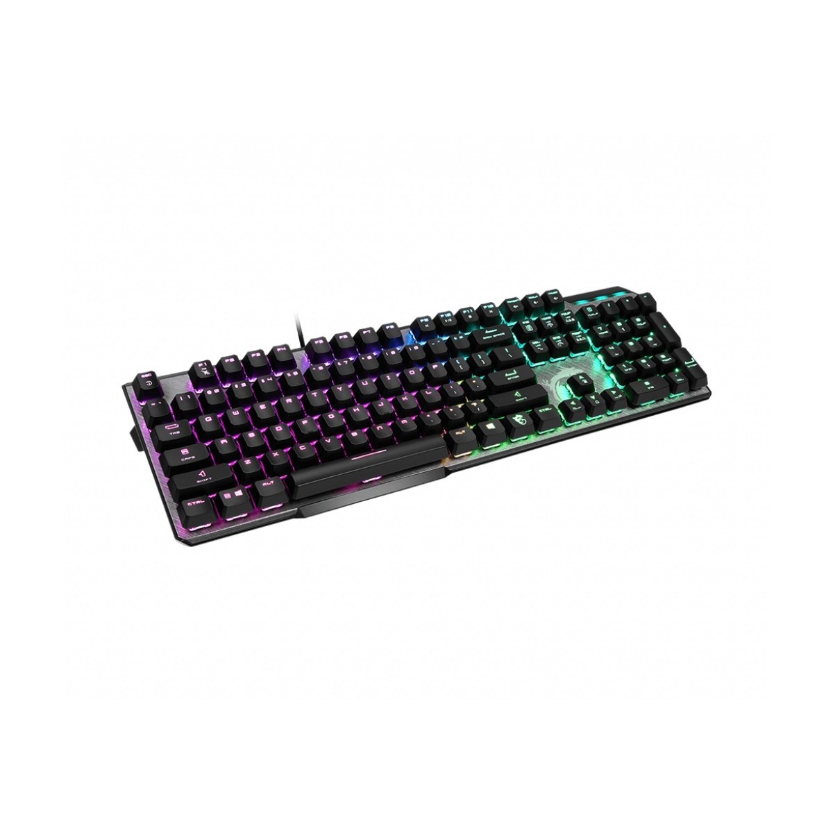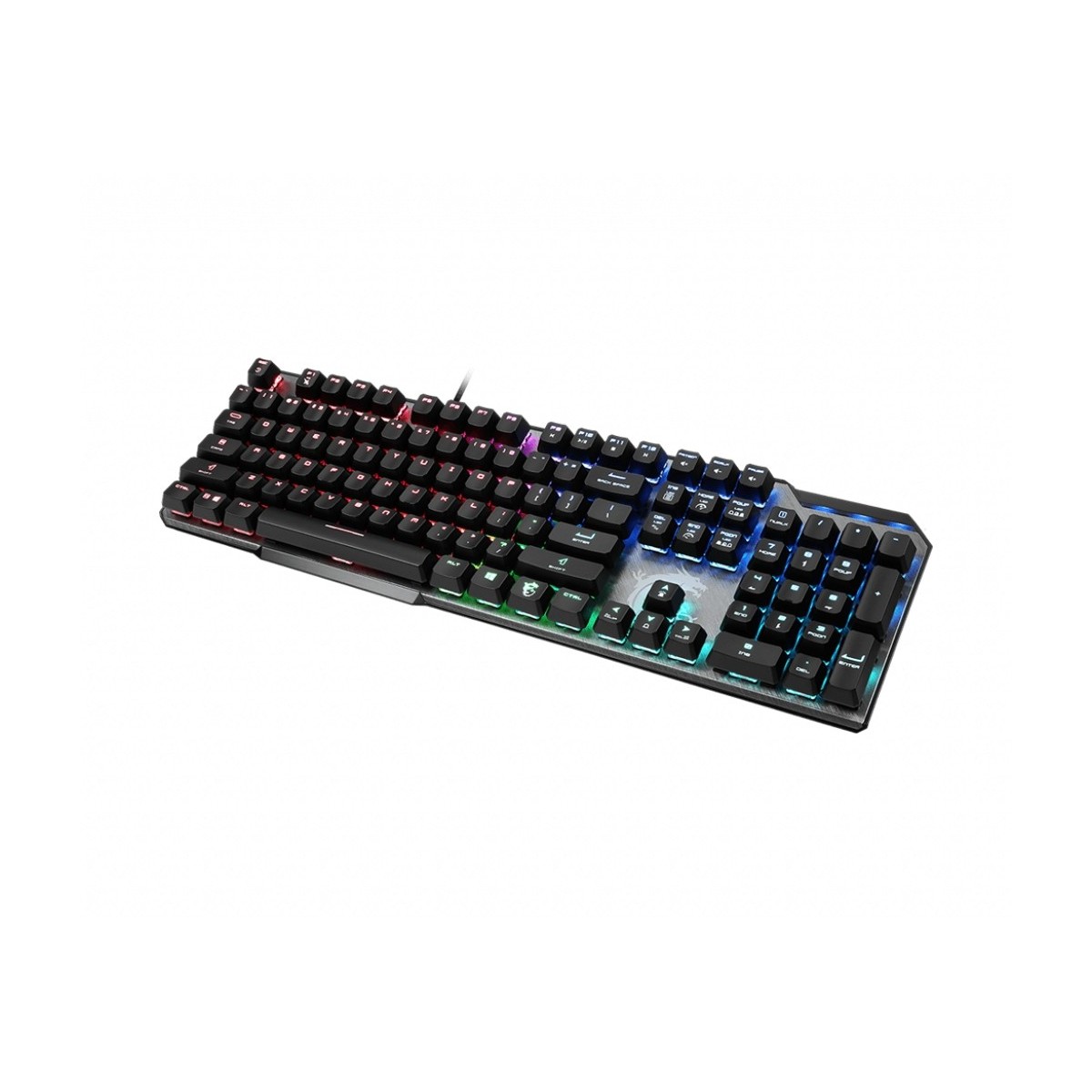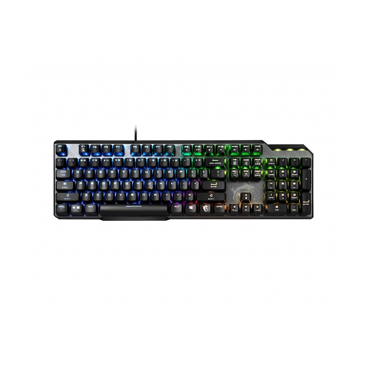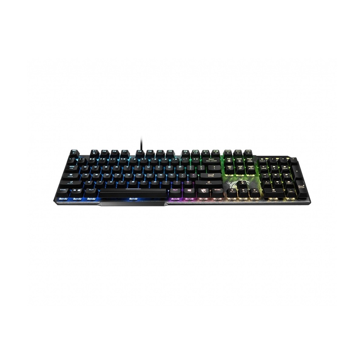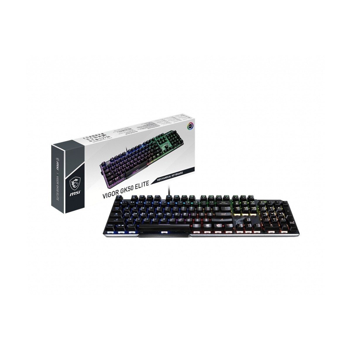 MSI Vigor GK50 Elite. Fattore di forma tastiera: Standard. Stile tastiera: Dritto. Interfaccia dispositivo: USB, Interruttore a chiave per tastiera: Interruttore a chiave a membrana, Struttura tastiera: QWERTY. Tipologia di retroilluminazione: LED RGB. Lunghezza cavo: 1,8 m. Utilizzo raccomandato: Giocare. Colore del prodotto: Nero, Metallico