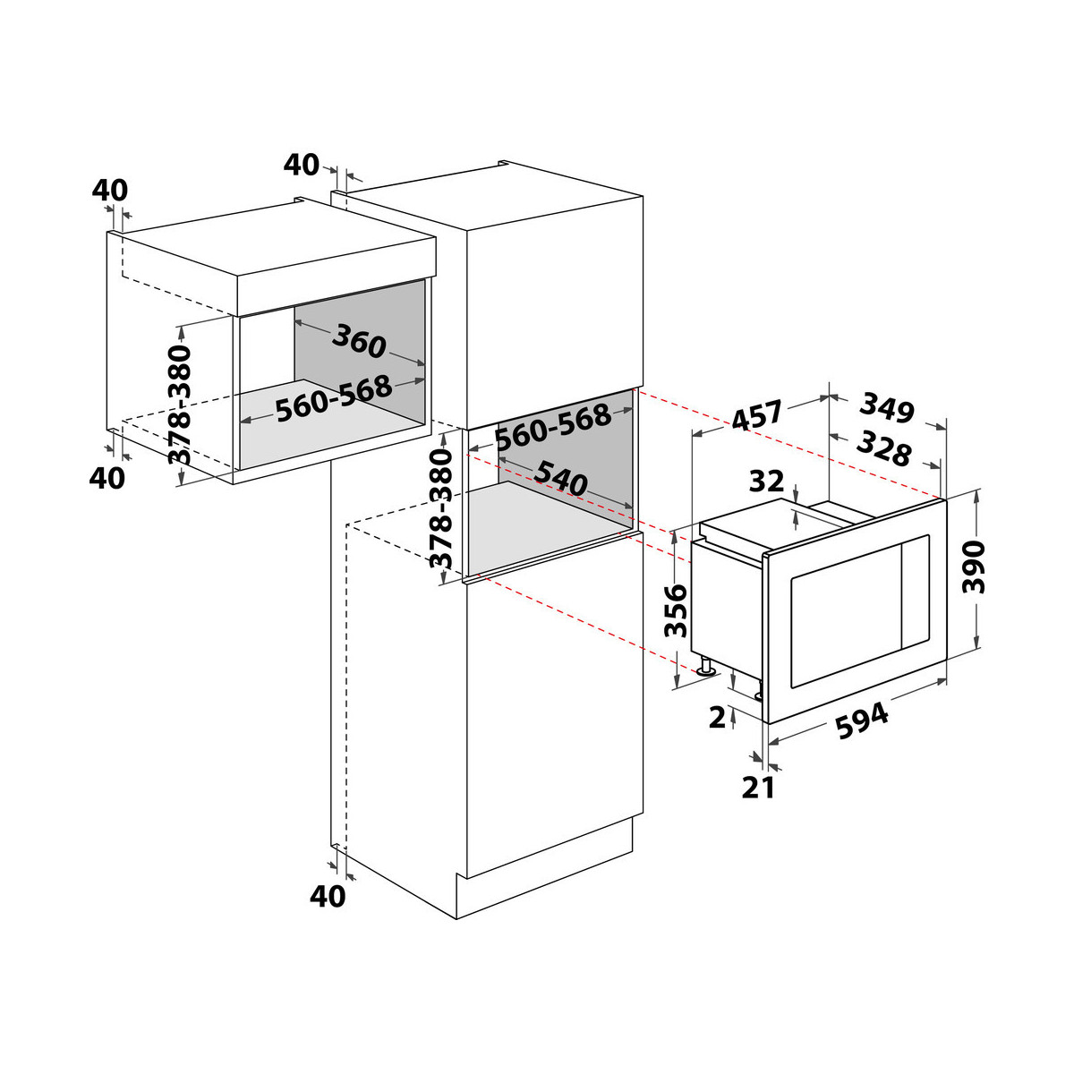 Indesit MWI 120 GX. Posizionamento dell'apparecchio: Da incasso, Tipo di prodotto: Microonde con grill, CapacitÃÂ interna: 20 L. Larghezza: 594 mm, ProfonditÃÂ : 349 mm, Altezza: 390 mm