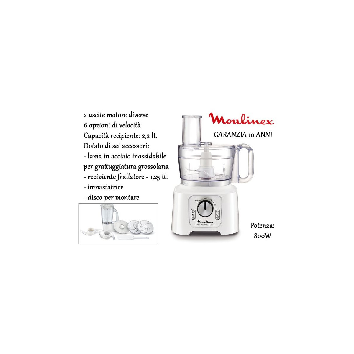 Moulinex Doubleforce compact. CapacitÃÂ vaschetta: 2,2 L. Colore del prodotto: Bianco, Materiale contenitore: Plastica, Materiale lama: Acciaio inossidabile. Potenza: 800 W