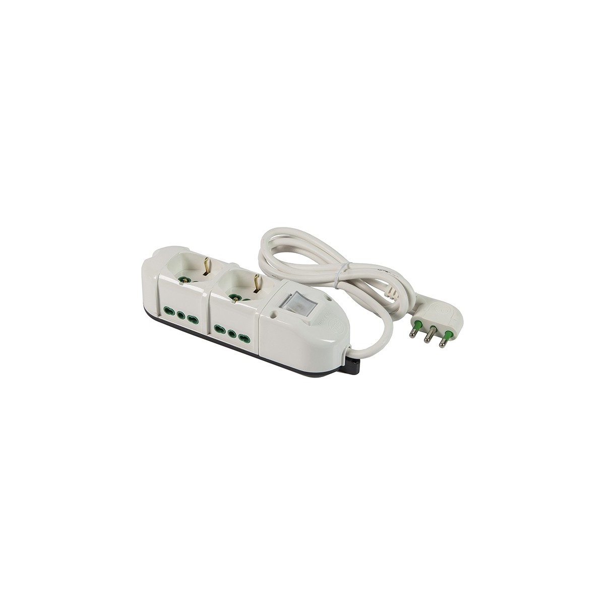 Fme Retail multipresa a 2 uscite 2P+T 16A Bipasso italo/tedesche e 4 uscite 2P+T16A (laterali) a bipasso italiane. Cavo 1,5m 3G1 H05VV-F. Spina a squadra italiana 2P+T 16A + interruttore bipolare luminoso.