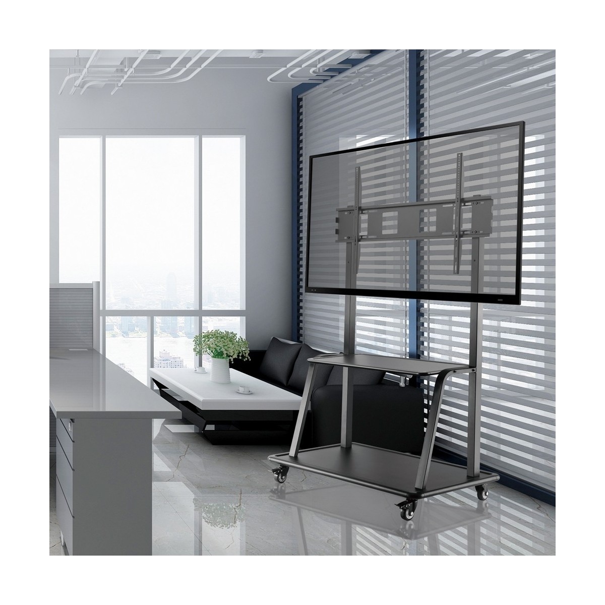 Il supporto a pavimento NewStar, modello NS-M4000BLACK è un mobiletto portatile per schermi LCD/LED/Plasma fino a 75" (191 cm) con altezza regolabile da 103 a 153 cm. Utilizzate un supporto a pavimento per sfruttare pienamente le capacità del vostro schermo.