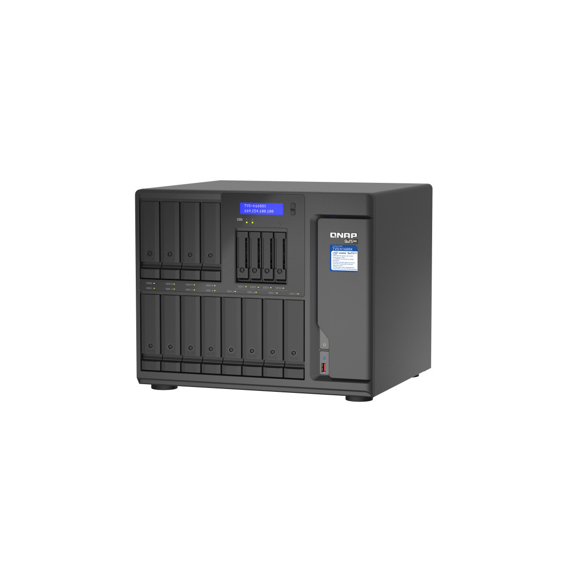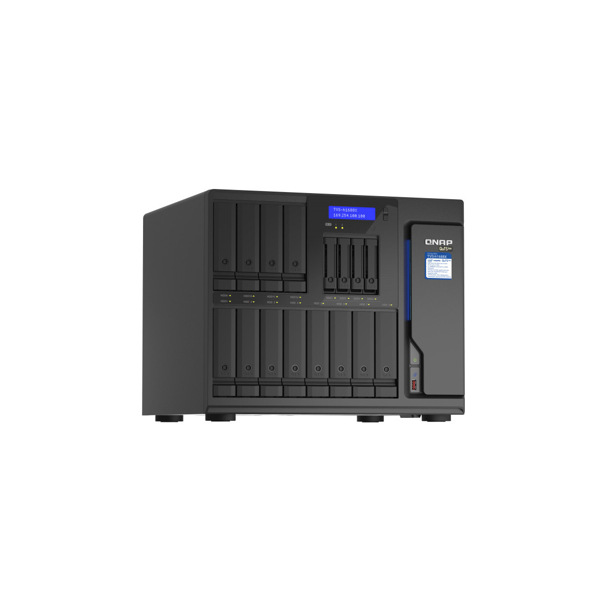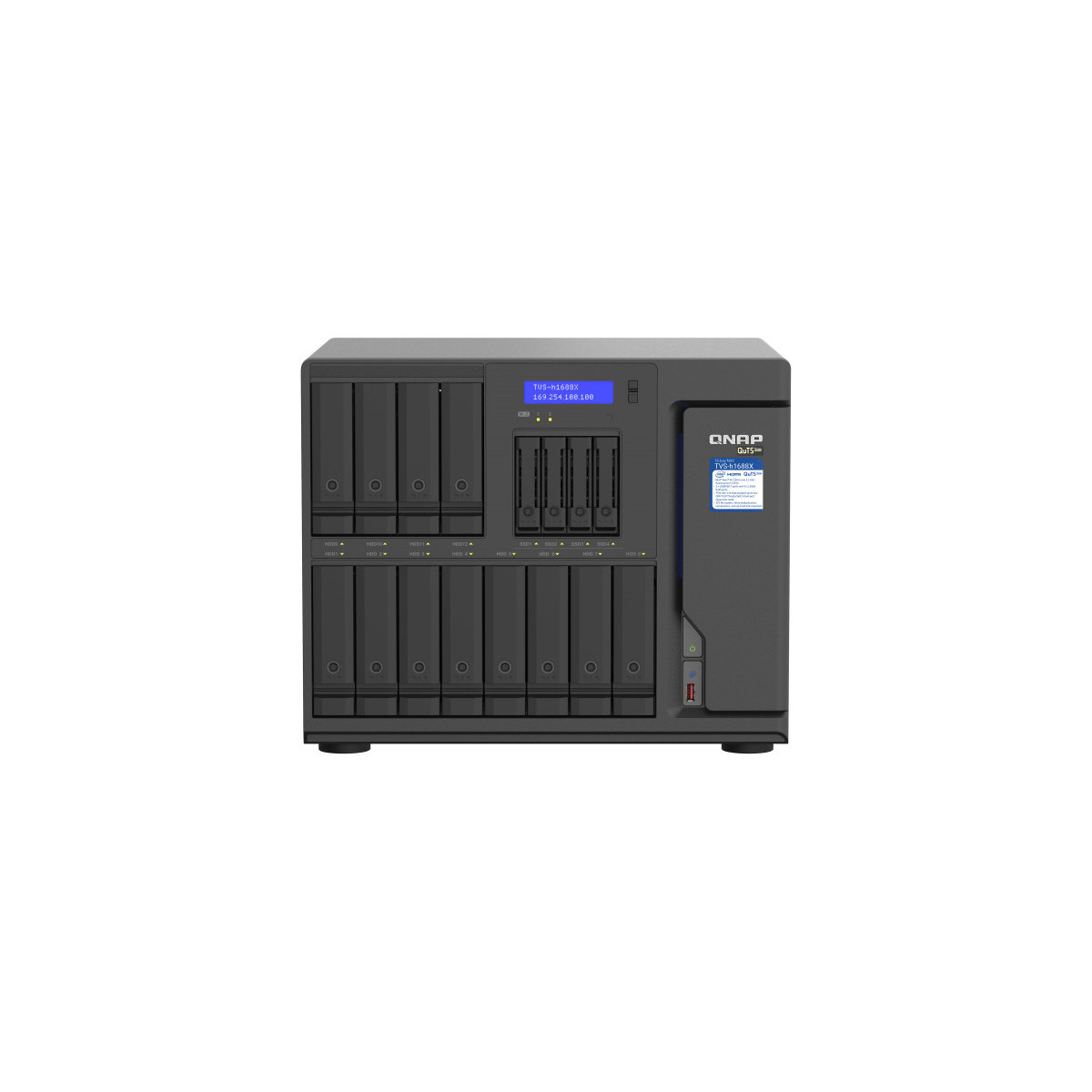 QNAP TVS-h1688X. Tipi di unità di archiviazione supportate: HDD & SSD, SSD, Interfaccia dispositivo di archiviazione: M.2, Serial ATA III, Dimensioni dei dispositivi di archivio supportati: 2.5,3.5,M.2. Famiglia processore: Intel® Xeon®, Produttore processore: Intel, Frequenza del processore: 3,3 GHz. RAM installata: 32 GB, Tipo di RAM: DDR4, Massima RAM supportata: 128 GB. Velocità trasferimento Ethernet LAN: 100,1000,2500,10000 Mbit/s. Tipo di case: Tower, Tipo di raffreddamento: Attivo, Colore del prodotto: Nero