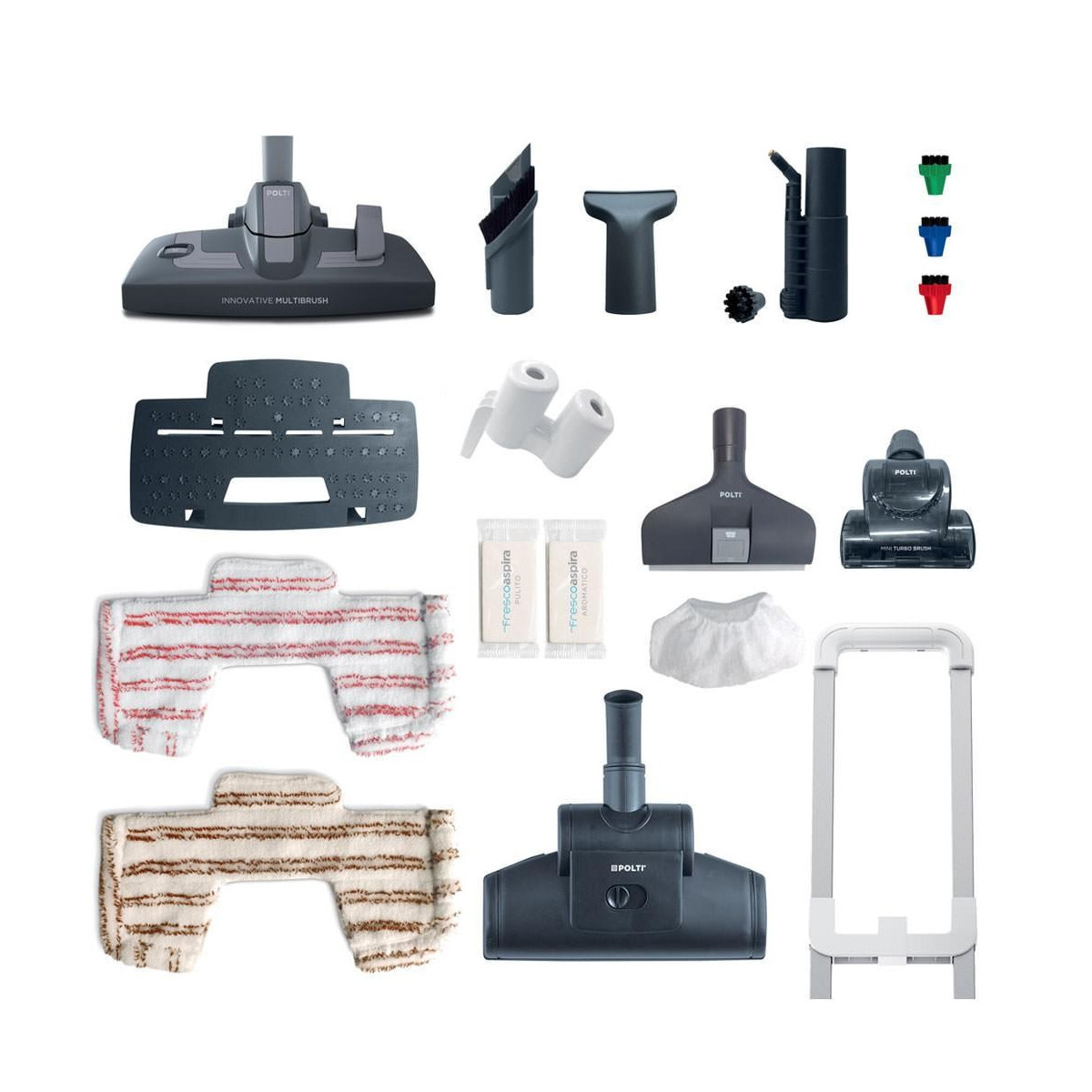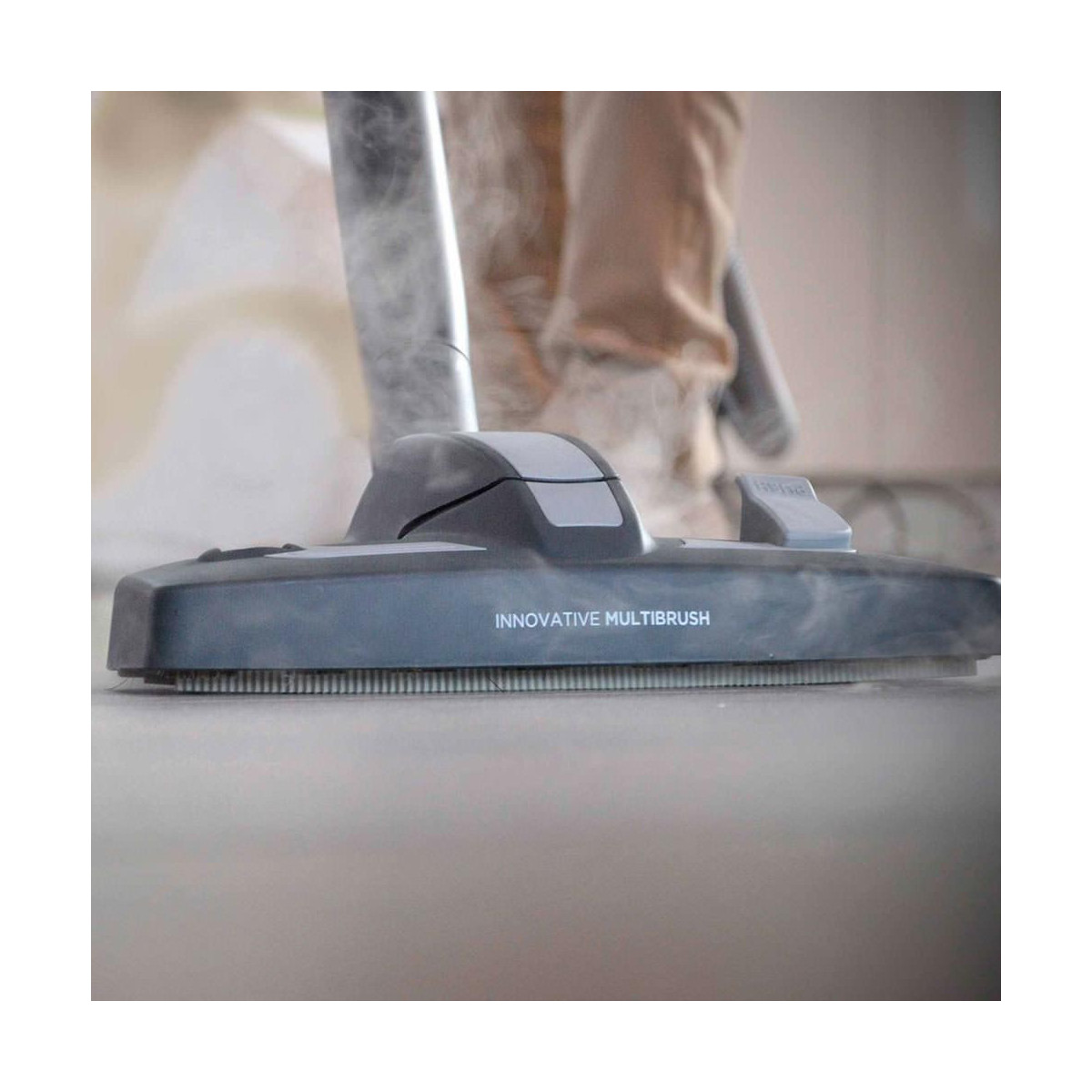 Multibrush è l'innovativa spazzola multiuso progettata per aspirare, pulire con il vapore e asciugare le superfici. Basta un solo click per scegliere la posizione della spazzola a seconda della superficie da pulire e della funzione da utilizzare: senza inserti per aspirare oppure lavare e asciugare tappeti e moquette, o ancora per applicare il panno che permette di lavare e asciugare le superfici delicate; con le setole per aspirare pavimenti duri e delicati; con gli inserti gommati per lavare e asciugare i pavimenti duri o per aspirare lo sporco umido.