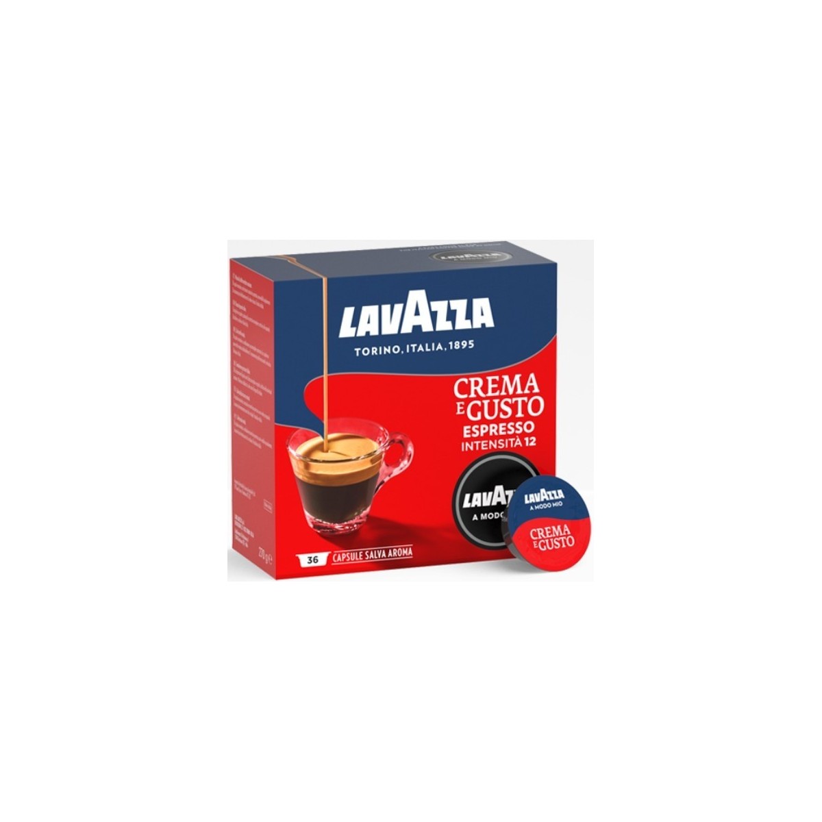Lavazza Crema e Gusto. Tipo di prodotto: Capsule caffè, Tipologie di bevande: Espresso, Livello di tostatura del caffè: Tostatura media. Peso: 270 g. Tipo di imballo: Scatola. Quantità per pacco: 36 pezzo(i)