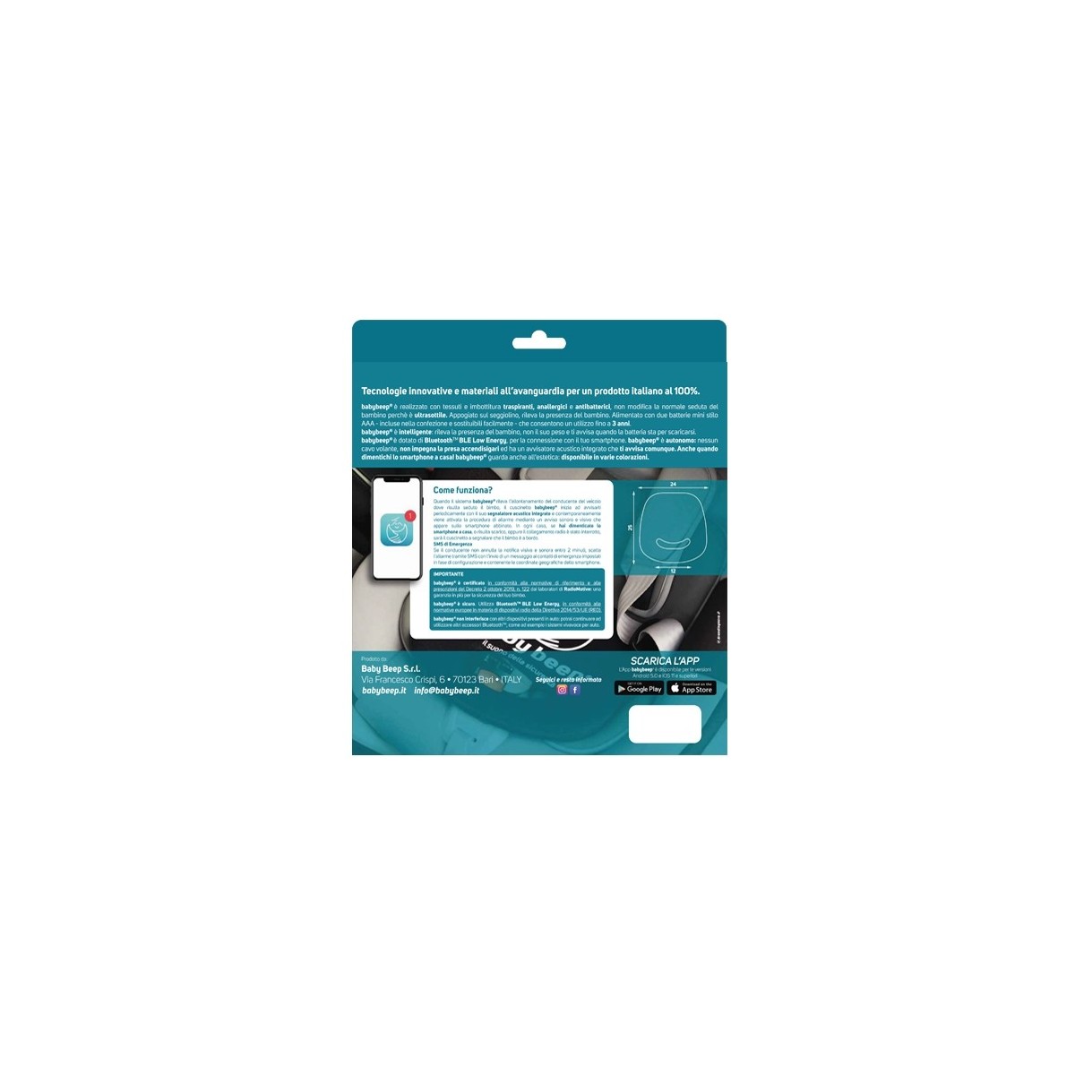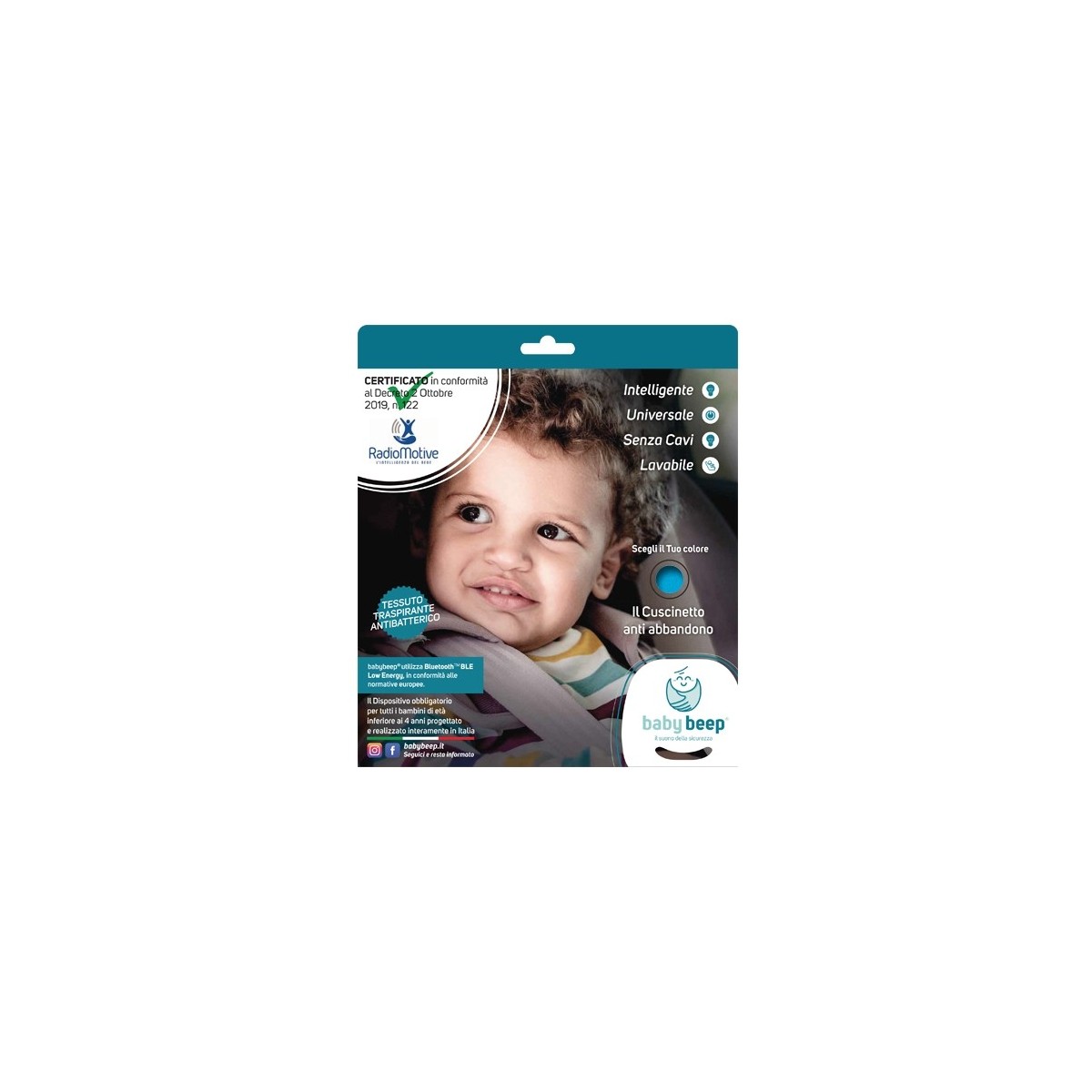 Acquista babybeep®, il sistema antiabbandono a norma di legge, certificato e omologato. Zero spese di spedizione e puoi pagare in totale sicurezza con carta di credito attraverso il circuito paypal. Il cuscinetto è universale, si posiziona sulla seduta del seggiolino e dialoga tramite tecnologia BluetoothTM con l'app babybeep®, scaricabile gratuitamente dagli store Google Play (Android) e Apple Store (iOS) e facilmente installabile sullo smartphone del conducente.