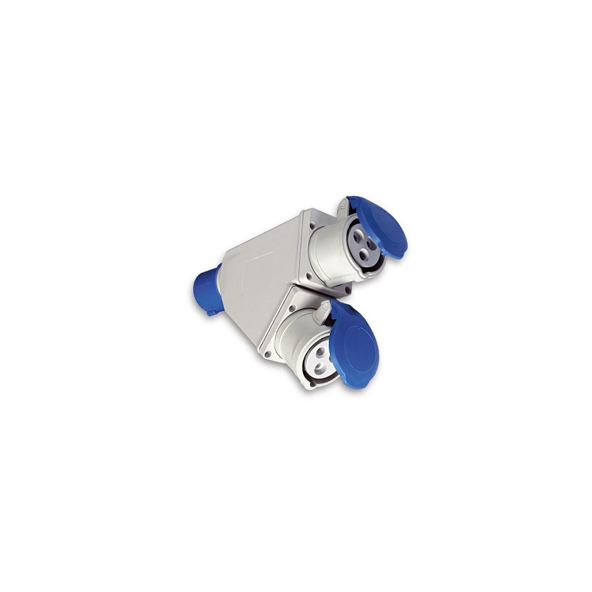 Adattatore industriale CEE blu costruito nel rispetto della normativa CEI EN 50250. IP44 da spina 2P+T 16A a 2 prese 2P+T 16A.