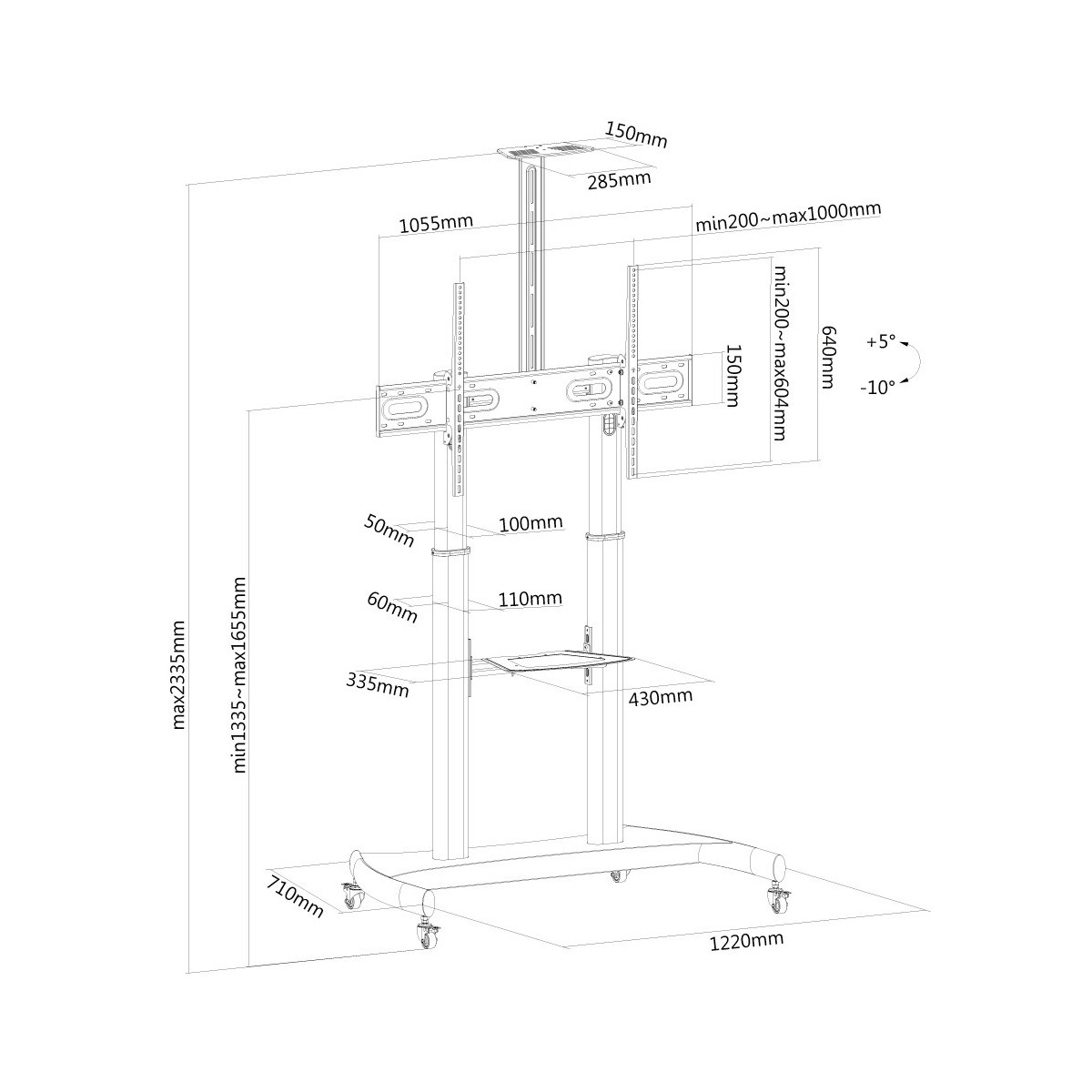 Newstar Mobiletto portatile per TV. Peso massimo (capacità): 100 kg, Capienza minima dimensioni dello schermo: 152,4 cm (60"), Capienza massima dimensioni dello schermo: 2,54 m (100"), Compatibilità interfaccia di montaggio (min): 400 x 400 mm, Compatibilità interfaccia di montaggio (max): 1000 x 600 mm. Colore del prodotto: Nero