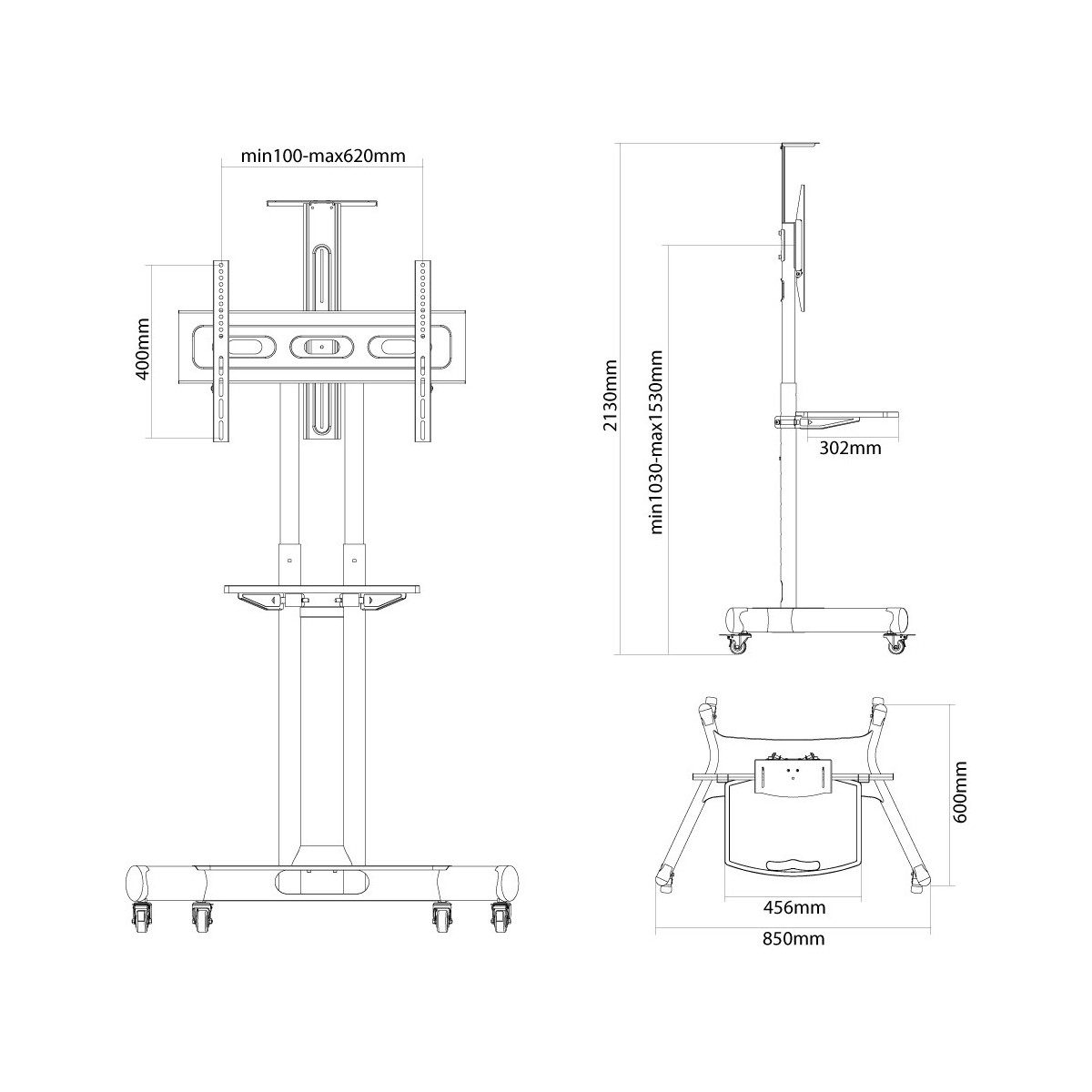 Il supporto a pavimento NewStar, modello NM-M1700BLACK è un mobiletto portatile per schermi LCD/LED/Plasma fino a 75" (191 cm) con altezza regolabile da 103 a 153 cm.