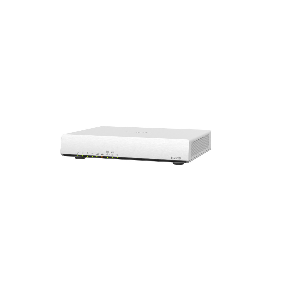 QNAP QHora-301W. Banda Wi-Fi: Dual-band (2.4 GHz/5 GHz), Wi-Fi standard: Wi-Fi 6 (802.11ax), Intervallo di trasferimento dei dati WLAN (max): 2475 Mbit/s. Tipo di prodotto: Router da tavolo, Colore del prodotto: Bianco. Tipo di antenna: Interno, Livello di guadagno dell'antenna (max): 5 dBi. Produttore processore: Qualcomm, Frequenza del processore: 2200 MHz, RAM installata: 1000 MB. Tipologia alimentazione: dC, Voltaggio di uscita: 12 V, Consumi: 24 W