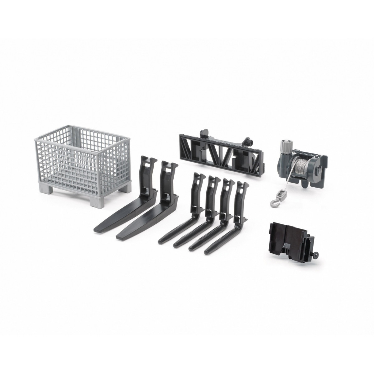 Il set accessori per il caricamento frontale consiste in un adattatore, una box paletta, un varricello, 4 forche per il fieno e 2 forche per le palette. Un gioco di alta qualità con funzioni facili da capire che offrirà ore e ore di gioco realistico. Modello in scala 1:16. Proprio come quelli veri. I veicoli ideali per il gioco quotidiano sia nella stanza dei bambini come anche all?aria aperta. Non adatto a bambini di etá inferiore ai 3 anni.