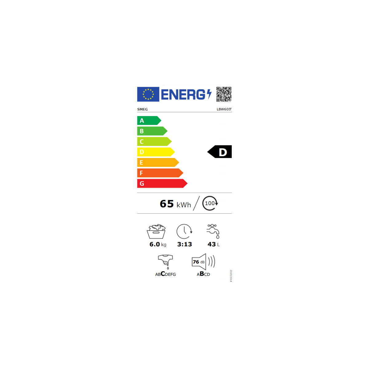 Smeg LBW60IT. Tipo di carica: Caricamento frontale. Capacità cestello: 6 kg, Classe di efficienza della centrifuga: C, Silenziosità (centrifuga): 76 dB, Silenziosità (lavaggio): 58 dB, Velocità di centrifuga massima: 1000 Giri/min. Classe efficienza energetica: D (A+++), Consumo energetico annuale: 151 kWh, Consumo annuale di acqua: 9900 L. Colore del prodotto: Bianco. Larghezza: 597 mm, Profondità: 497 mm, Altezza: 845 mm