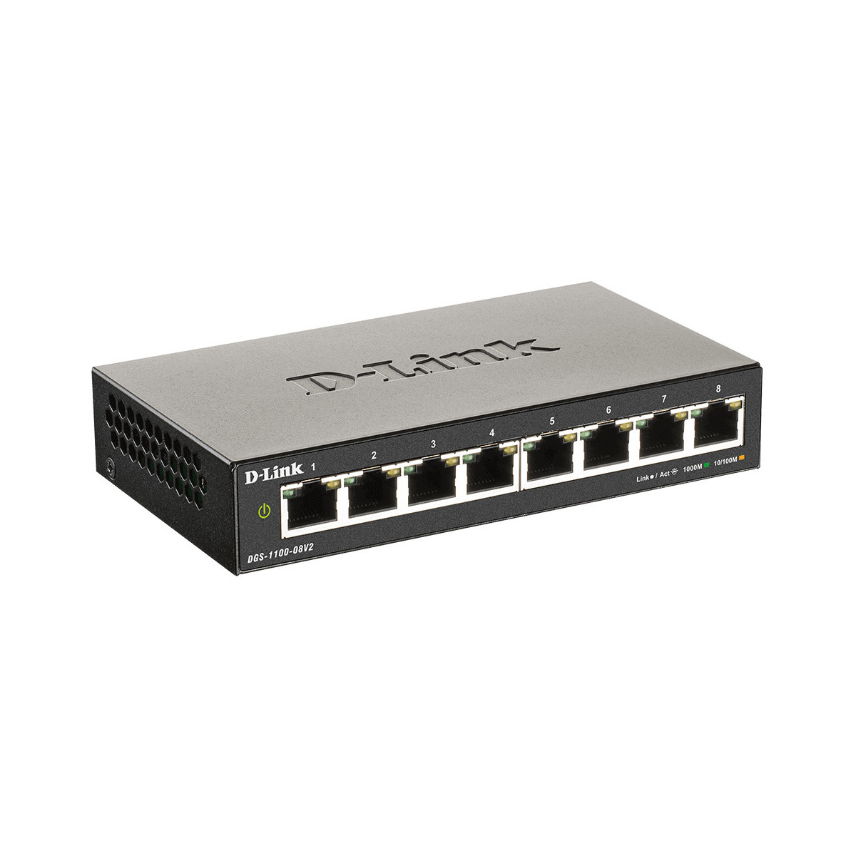 D-Link DGS-1100-08V2. Tipo di porte RJ-45: Gigabit Ethernet (10/100/1000), Quantità di porte RJ-45: 8. Capacità di commutazione: 16 Gbit/s. Voltaggio input DC: 5 V