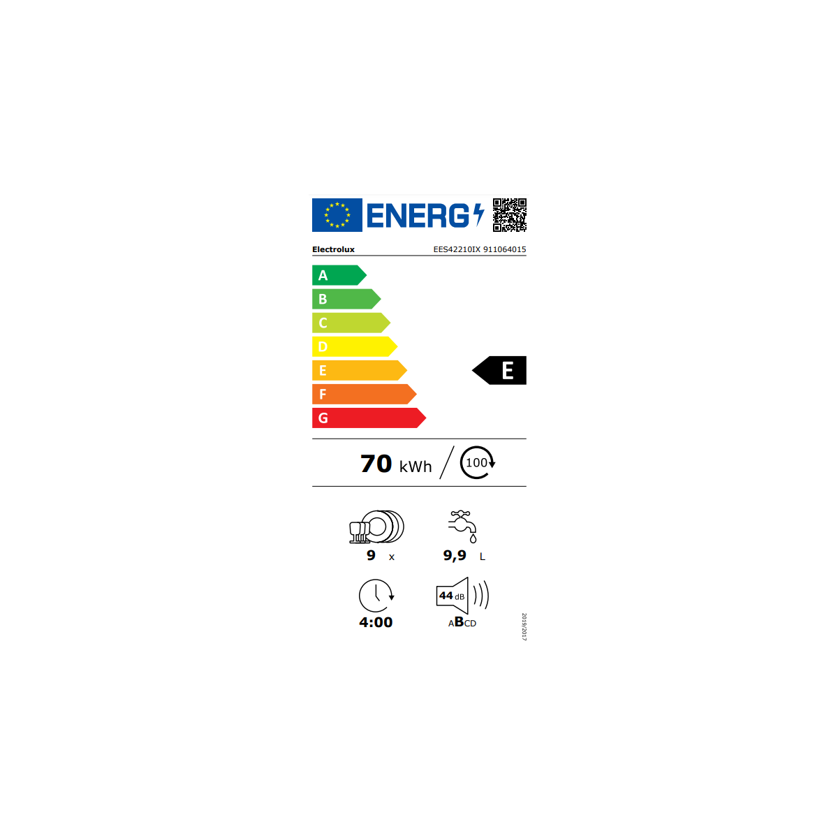 Electrolux EES42210IX. Posizionamento dell'apparecchio: A scomparsa Parziale, Dimensione: Compatta (45 cm), Colore della porta: Acciaio inossidabile. Numero di coperti: 9 coperti, Emissione acustica: 44 dB, Classe efficacia di asciugatura: A. Regolazione piedini: 8 cm. Classe efficienza energetica: E (A++), Consumo di energia per ciclo: 0,689 kWh, Consumo energetico annuo: 197 kWh. Larghezza: 446 mm, Profondità: 570 mm, Altezza: 818 mm