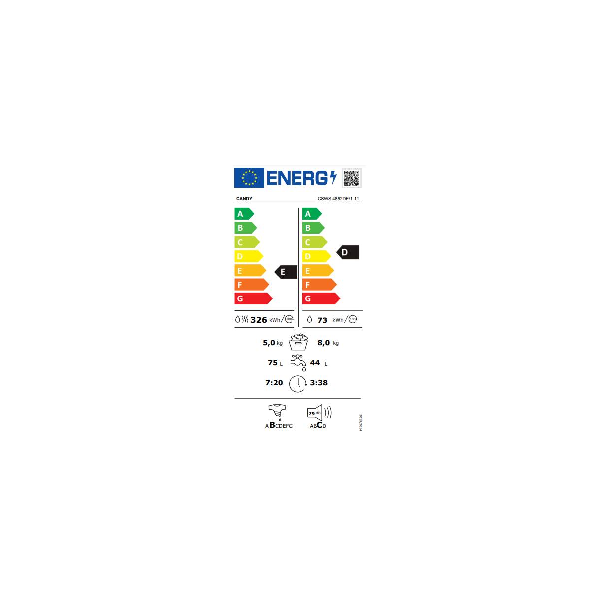 Candy CSWS 4852DE/1-11. Tipo di carica: Caricamento frontale, Posizionamento dell'apparecchio: Libera installazione, Colore del prodotto: Bianco. Capacità di asciugatura: 5 kg, Velocità di centrifuga massima: 1400 Giri/min, Classe efficacia di lavaggio: D. Classe efficienza energetica ciclo combinato: E, Consumo energetico annuale: 5440 kWh, Tensione di ingresso AC: 220 - 240 V. Larghezza: 600 mm, Profondità: 530 mm, Altezza: 850 mm